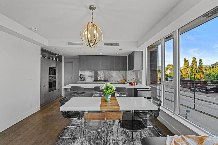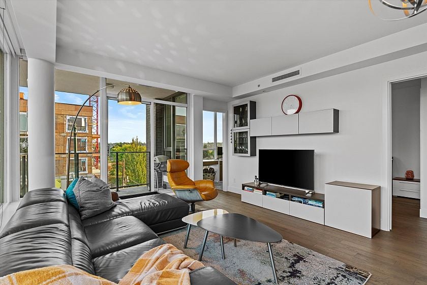 Welcome to THE RIDGE - a pet friendly building where luxury meets function in this lovely, air-conditioned SE CORNER 2 bdrm & den unit, 2-bath concrete home. Thoughtfully designed with zero wasted space, this residence showcases Cressey's renowned craftsmanship and attention to detail. Step into your chef's kitchen featuring Wolf & Sub-Zero appliances, marble/granite countertops and backsplash, and sleek European cabinetry. The 2 spa-inspired bathrooms include heated marble floors, rain showers and elegant vanities. Having lovely floor-to-ceiling windows, and wide-plank eng hardwood throughout, the home feels bright, open, and sophisticated. Additional features include roller blinds, two side-by-side parking stalls, large storage locker & insuite storage too! OPEN: SAT 20TH 2:30-4PM