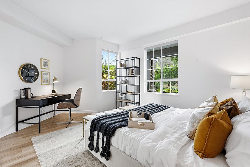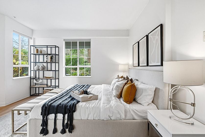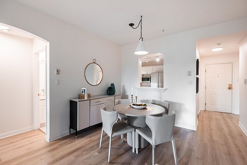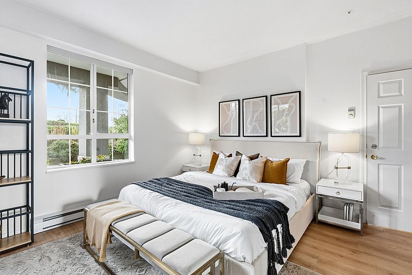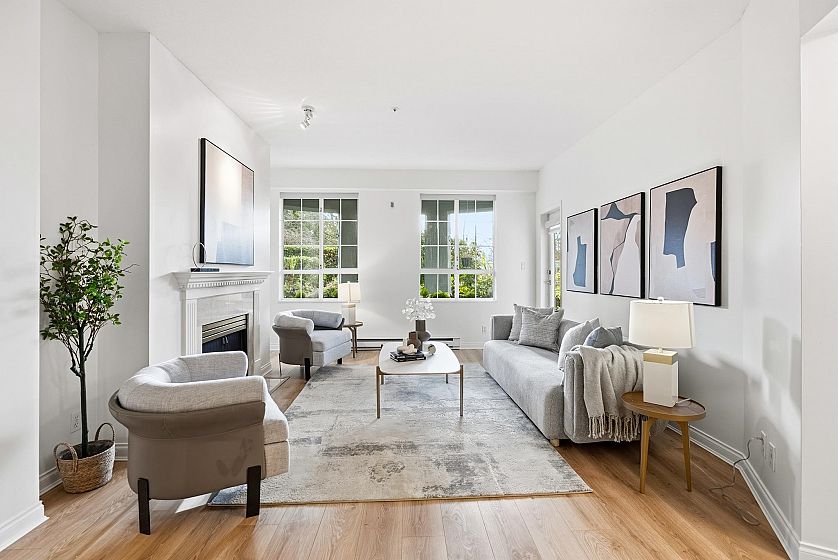 Freshly updated & budget friendly 2 bed + 2 bath condo at St James House at UBC ! This unit features over-height ceilings throughout, new laminate flooring, new paint, new lighting, & new stainless steel appliances. This home has separated bedrooms allowing for maximum privacy. The primary bedroom has a walk in closet & ensuite with tub & shower. The living room & dining room space boasts an open concept floor plan with a cozy gas fireplace, all overlooking your large covered ground floor patio for year-round entertaining. The kitchen offers plenty of storage & ample counter space. This unit comes w/ 2 parking stalls & 1 storage locker. St James House has a gym, hot tub, sauna, party room & visitor parking. A short walk to campus, close to Save on Foods, transit, restaurants & recreation.