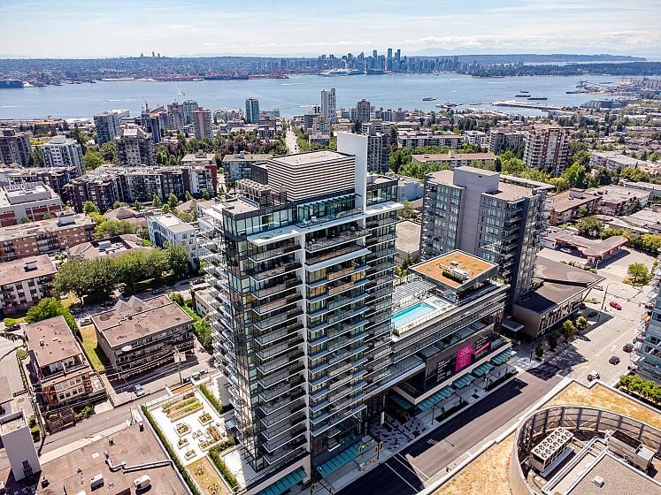1506 captures the North Shore views: the city skyline, ocean, Lions Gate Bridge, mountains & serene pool view below. This modern 2-bed, 2-bath corner residence offers over 1,000 sqft of refined living with south, west, and north exposures, showcasing breathtaking scenery from every angle plus two spacious balconies. This unit features floor-to-ceiling windows, a chef-inspired kitchen with premium integrated appliances, a gas cooktop, an oversized waterfall quartz island, LED lit cabinets. Luxury upgrades include motorized blinds, high-end custom closet millwork in the ensuite, a built-in wine fridge, pot lights in the bedrooms, and an elevated palette of premium finishes throughout. Parking and bigger storage. Pics, Floorplan, Pics & video are for 1406!