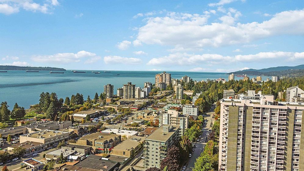Enjoy expansive Sea-to-Sky views from this well-maintained sub-penthouse. Floor-to-ceiling windows line the south side of the home, while the bedrooms capture sweeping mountain views, providing excellent natural light throughout. The thoughtfully designed layout features a welcoming foyer, generous living and dining areas, & oversized covered balcony ideal for year-round use. This well-maintained building has significant updates, including rainscreening, new elevator, EV charging capability, & is pet-friendly (1 dog or 1 cat). Insuite laundry, 1 parking spot & large storage locker. This boutique building has only 2 units per floor. All of this, just steps from the shops, restaurants, and waterfront lifestyle of Ambleside— a truly exceptional place to call home.