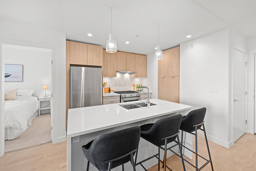 City, Ocean & Park VIEWS from every room in this perfectly laid out 2-bedroom home at CREST! You'll love the open-concept floor plan w/ high-quality finishes & a sunny south-facing patio, perfect for morning coffee or summer BBQs. Entertain w/ ease in your gourmet kitchen w/ a gas range, large island w/ waterfall-edge, pendant lighting, & built-in pantry. Thoughtfully designed for comfort & privacy, bedrooms are spacious & positioned on opposite sides of the home, complemented by spa-inspired bathrooms, in-floor radiant heating, & ample storage throughout. Experience the best of North Shore living w/ Whole Foods, Victoria Park & the Shipyards just steps away. Invest w/ confidence in this 4-year-young building w/ warranty & fantastic amenities.