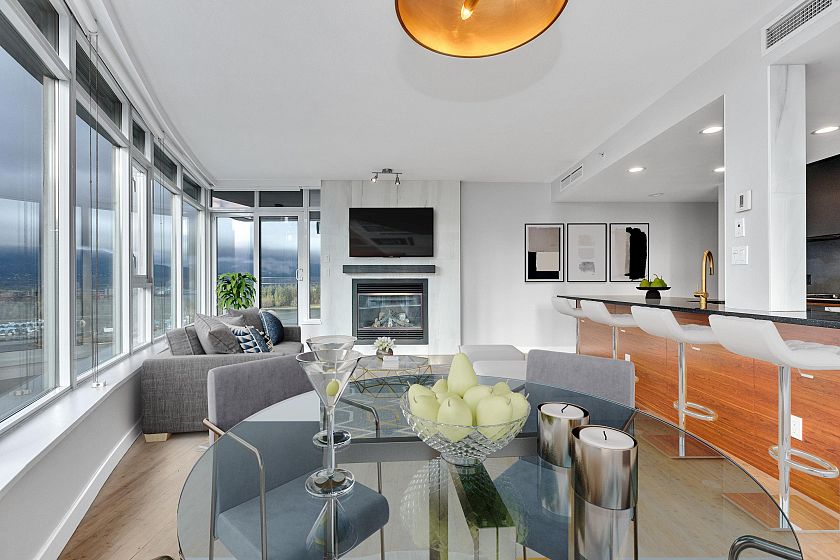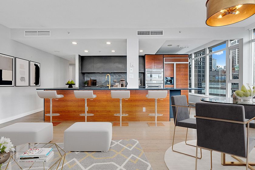 Discover the epitome of luxury living in this remarkable renovated 2-bed 2-bath waterfront apartment within the prestigious Carina building. Offering an open-concept layout, this coveted 04 plan boasts 1,242 square feet of living space, complemented by two balconies thoughtfully situated on a single level. Captivated by the inspiring 180° unobstructed vistas of Coal Harbour, Stanley Park, and the North Shore Mountains. The spacious living area provides a front-row seat to watch the vibrant activity along the seawall, from pedestrians to departing cruise ships. Resort-style amenities, including an indoor pool and hot tub for relaxation, a rejuvenating steam sauna, well-appointed fitness center, meeting room, theater and the assurance of a 24-hour concierge, w/ 2 Parking stall and Storage.