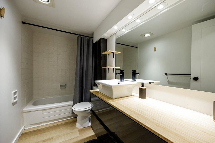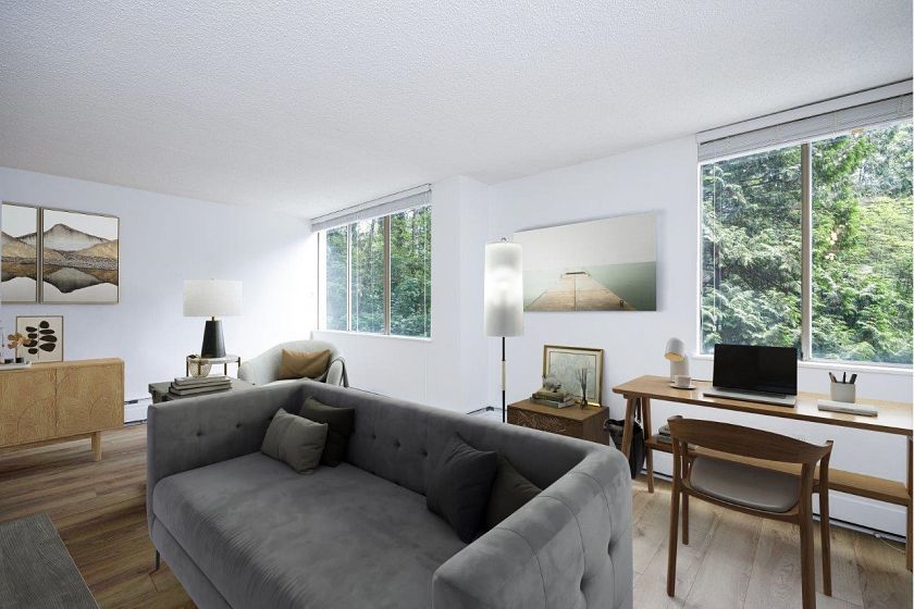 Great value here for this spacious and fully renovated, 906 sq ft, 2 bedroom plus den/storage unit is located in the popular Seymour building at Woodcroft. A beautiful renovation was completed in 2020 including paint, updated bath and stunning kitchen with quality wood countertops and new appliances. The corner unit has a lovely, green and private outlook. Relax on the covered balcony. Incredible amenities include indoor pool, whirlpool, gym, sauna and workshop. Parkade membrane project ongoing but has been paid for. A treat to view...just move in!