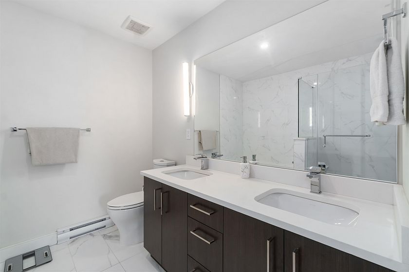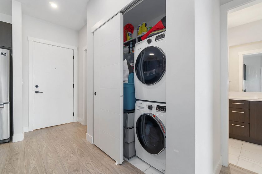 TOP FLOOR at Tatlow Homes! Don't miss this PENTHOUSE beautifully designed 2 bed, 2 bath in Lion's Gate Village area. This spacious home is appointed with laminate flooring, quartz counters, full-sized stainless appliances, and roller shades. Enjoy natural light streaming through large bay windows & step out onto one of TWO private balconies taking in views of Downtown Vancouver. The large primary bedroom features a walk-through closet & an en-suite with a tub, frameless glass shower, & dual-vanity countertop. This home even has a perfect office-sized den for a work from home setup. Located near Park Royal, Ambleside Beach, & Downtown Vancouver, this home offers the perfect blend of comfort & accessibility. 1 parking + 1 locker included. OPEN HOUSE: Sunday, Feb 8th, 12:30PM - 2:00PM