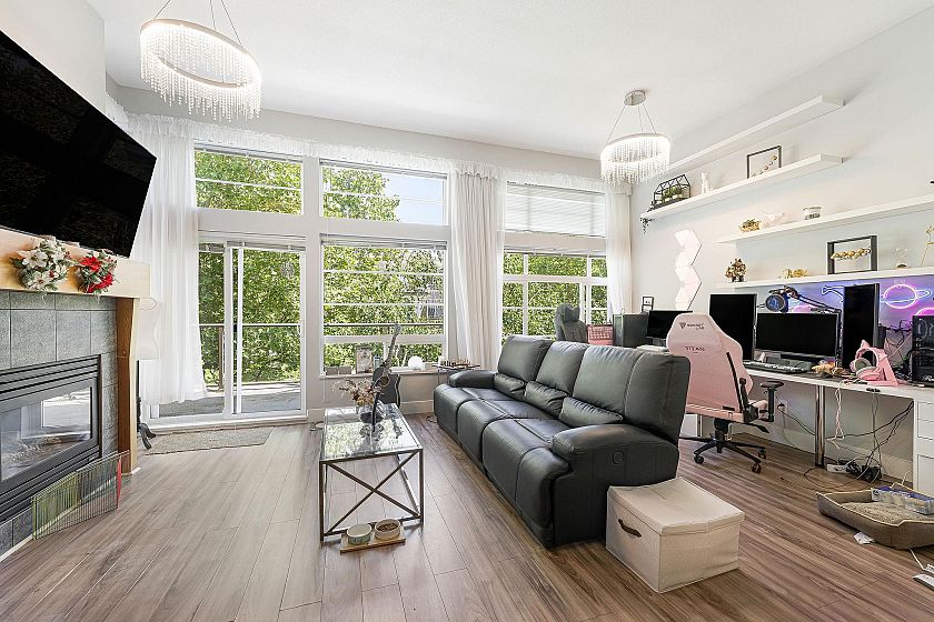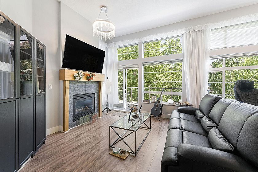 Perched on the top floor of Journey by award-winning developer Adera, this exceptional 2 bed and 2 bath home offers refined West Coast living. The bright, open layout is enhanced by dramatic 11-foot ceilings and oversized windows that fill the space with natural light. Thoughtfully designed, the suite features a gas fireplace, a chef-inspired kitchen with gas cooktop and expansive pantry, and stylish laminate flooring throughout. Step outside to a spacious wraparound balcony and take in peaceful views of the lush Greenway below. Residents also enjoy access to a common rooftop terrace showcasing stunning ocean views and unforgettable sunsets. 1 parking and 1 locker. Ideally situated steps from the Old Barn Community Centre, transit, and close to schools, parks! COME VIEW TODAY!