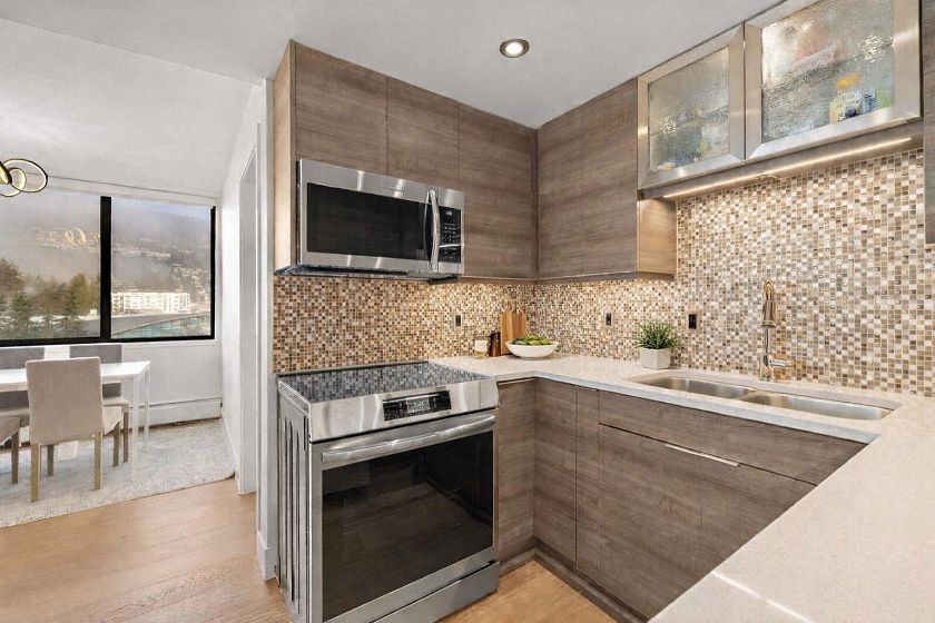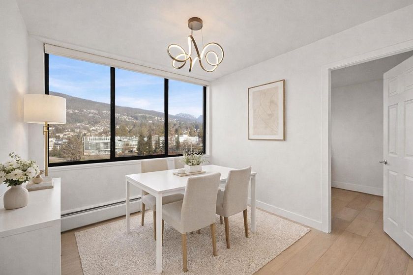 Welcome to this sunny two bedroom + den, two bathroom 1,202 sqft home in one of West Vancouver’s most sought after concrete buildings - Vandemar West. The property is fully renovated and showcased sparkling ocean views to the West and majestic mountain views to the North and East. Features include: sleek kitchen w quartz counters & stainless steel appliances, engineered hardwood floors, cozy electric fireplace, spacious primary w walkthrough closets to ensuite, in-suite laundry, two side by side parking spaces and storage locker. BONUS - den is large enough to be used as a 3rd bedroom. Enjoy the summer sun at the building’s outdoor pool. Truly the perfect location to have a walkable lifestyle and take advantage of the many amenities, restaurants and shops that Ambleside has to offer.