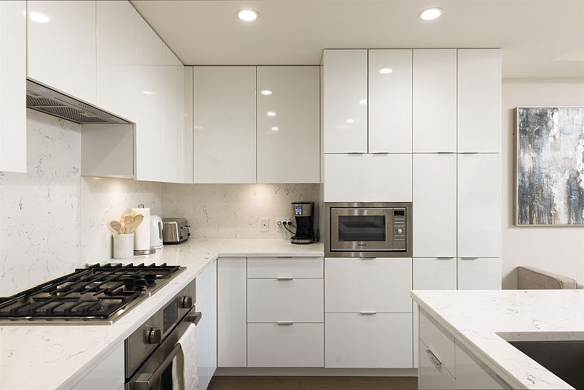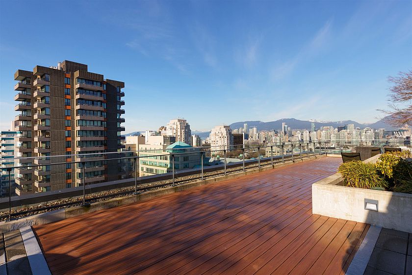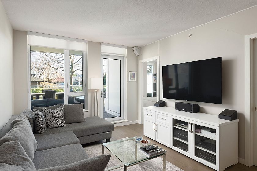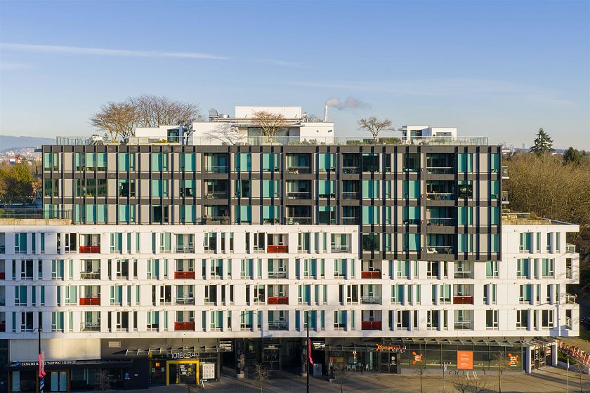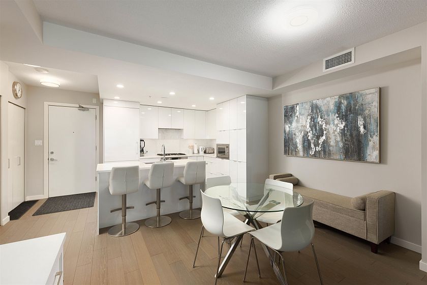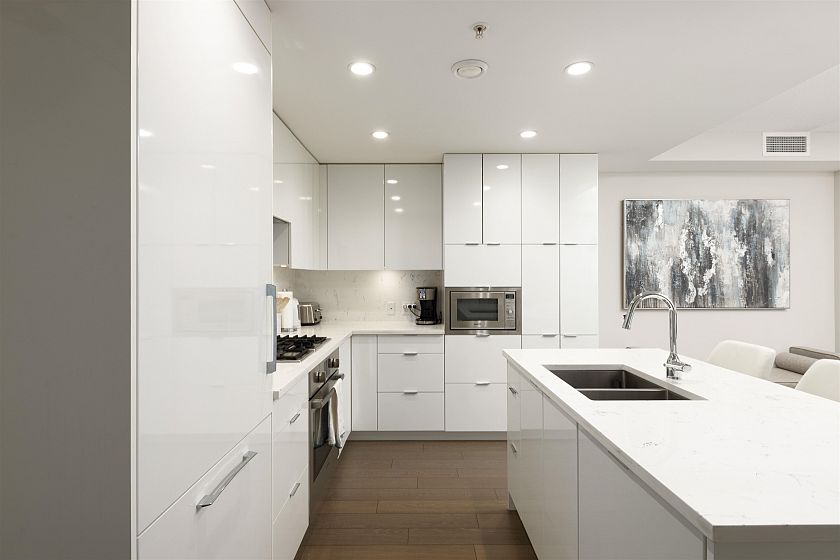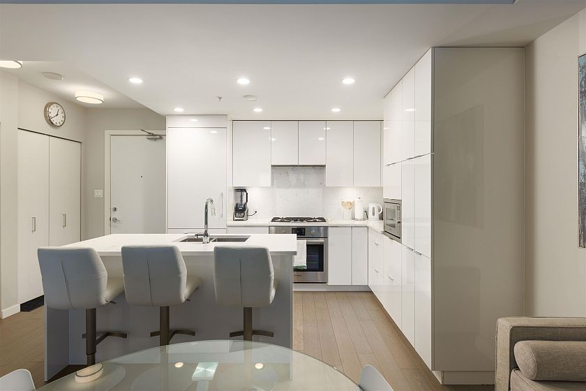 Quietly positioned on the peaceful side of the building, this 2-bed/2-bath home is designed for real life. A highly functional floor plan places bedrooms on opposite sides for privacy, with 2 dedicated areas ideal for home offices. Open-concept living & dining flow seamlessly into a generous kitchen featuring integrated appliances, quartz counters & backsplash, & ample storage. An expansive 480sqft terrace extends the living space outdoors—perfect for entertaining, relaxing, or everyday enjoyment. The primary suite offers custom built-in closets & a spa-inspired ensuite with double sinks, soaker tub, & separate shower. Complete with air conditioning, concrete construction, parking, and storage, just steps to transit, schools, & the shops and cafés of Mount Pleasant, Fairview, & Cambie.