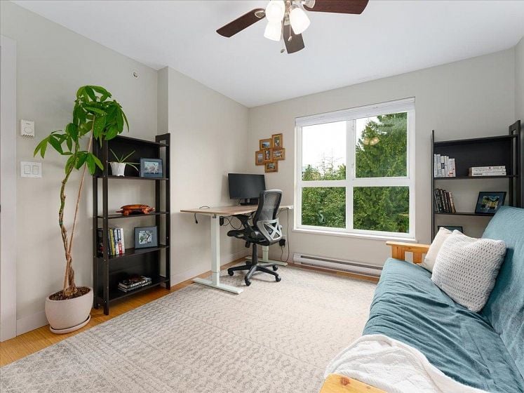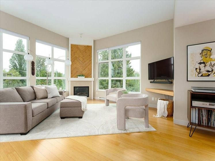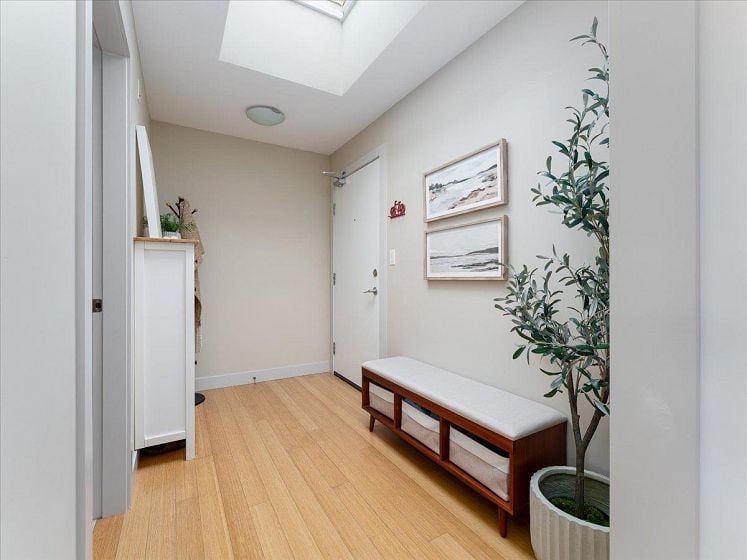 Sunlight sets the scene in this southwest-facing corner penthouse, where vaulted ceilings and skylights create a bright, open feel. Bamboo floors, a gas fireplace, and a sunny balcony with gas hookup invite easy living and year-round entertaining. Perfectly placed for an active North Shore lifestyle, the home is steps from the Mt. Seymour shuttle and close to golf, forest trails, and an extensive bike network. Deep Cove’s restaurants and water activities are just minutes away. A gourmet kitchen with quartz counters and stainless steel appliances anchors the space, complemented by two spacious bedrooms, two full baths, private storage, and three parking stalls. Fresh paint, updated blinds, and a new washer and dryer make this boutique, pet- and rental-friendly home move-in ready.
