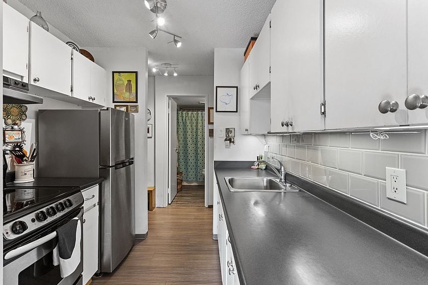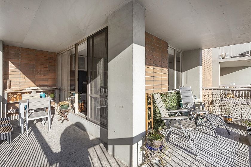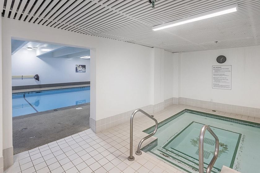 Bright SE facing corner unit with wrap around balcony and garden view. 1 full bath plus 2 piece ensuite. Great potential! Bring your ideas. Heat, Hot Water and Hydro included in the monthly strata fee. Building includes indoor pool, sauna, hot tub, billiard room, workshop, exercise room. Investment or occupy, best value in North Vancouver!