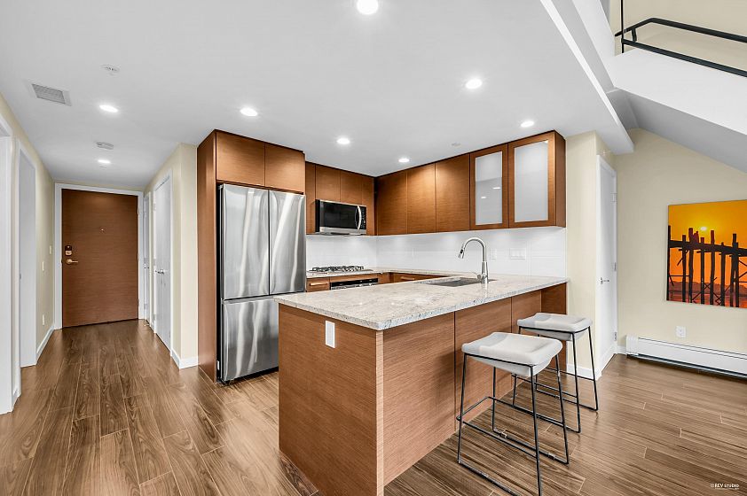 Luxury loft living in Vancouver’s coveted Oakridge neighborhood. This rare concrete unit boasts soaring 16’ ceilings, expansive windows with roller shades, and a private outdoor space. The open-concept layout includes a sleek kitchen with Fisher & Paykel appliances and granite counters, while the added versatility of a den/second bedroom (please note: the second bedroom has no closet) and a second full bath sets it apart. High-end laminate flooring flows throughout, offering durability and style. Tucked away from the bustle yet moments from the Canada Line, Oakridge Centre, parks, and Langara College. Quick access to Richmond completes this urban retreat. Open House: Feb 7&8 (Sat&Sun) 2-4pm