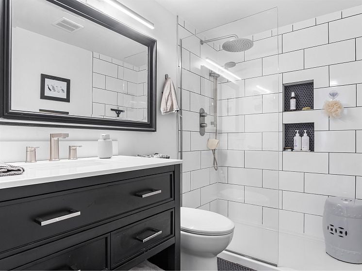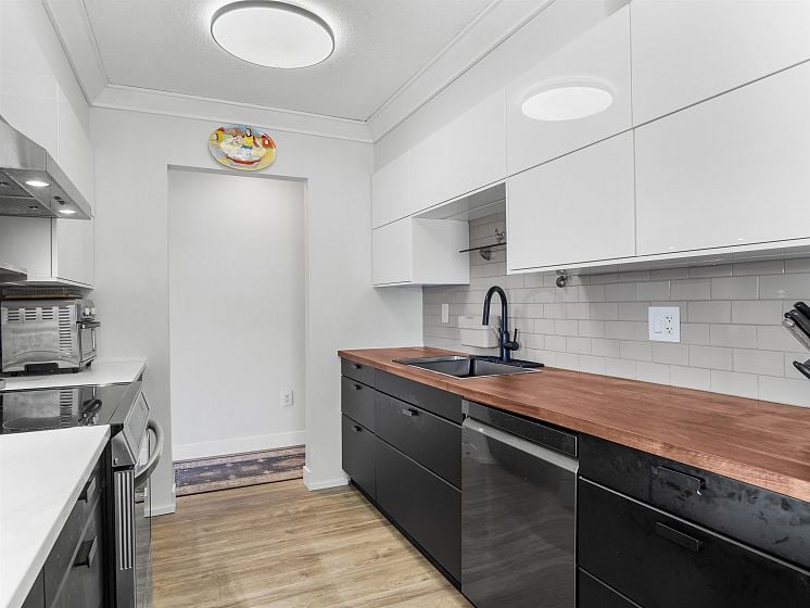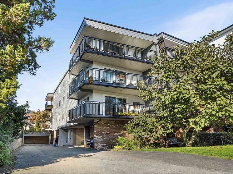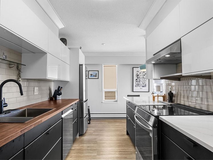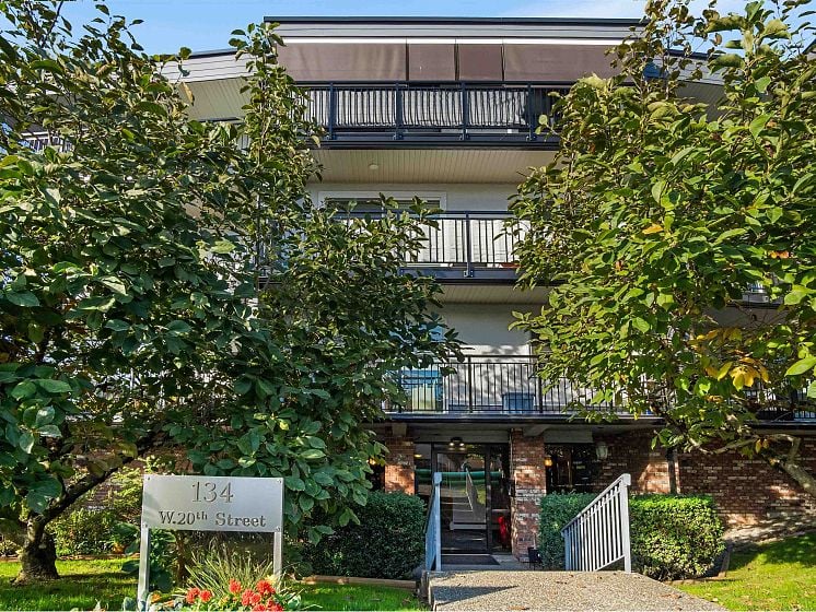 Top floor, south facing corner unit in Central Lonsdale! This gorgeously renovated 2BR/1BA condo has extensive updates. In the kitchen, recent appliances with induction stove plus all new cabinets, wood and stone countertops extended to an eating area. The large, bright living/dining area features durable wide plank vinyl floors, plus an updated gas fireplace and looks out to a huge and sunny wrap around balcony that overlooks the treed street. Beautifully tiled bathroom has an updated shower with inset nooks for storage. Recent closet doors, light fixtures. The well-run building has many upgrades including balconies, windows, sliding doors, electrical, plumbing. Steps away from all Central Lonsdale shops, medical, new Harry Jerome and minutes to the highway. 1 pkg, 1 stg, dog or cat ok.