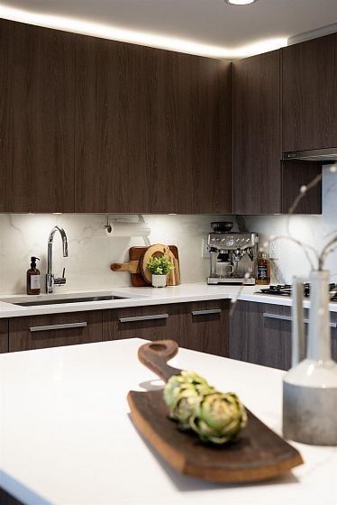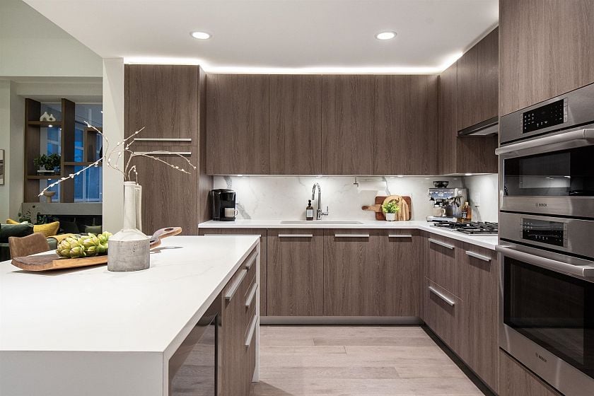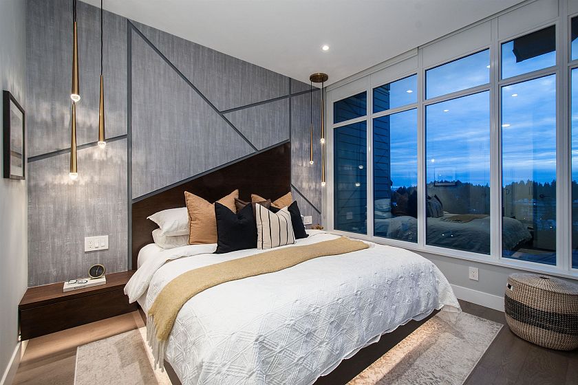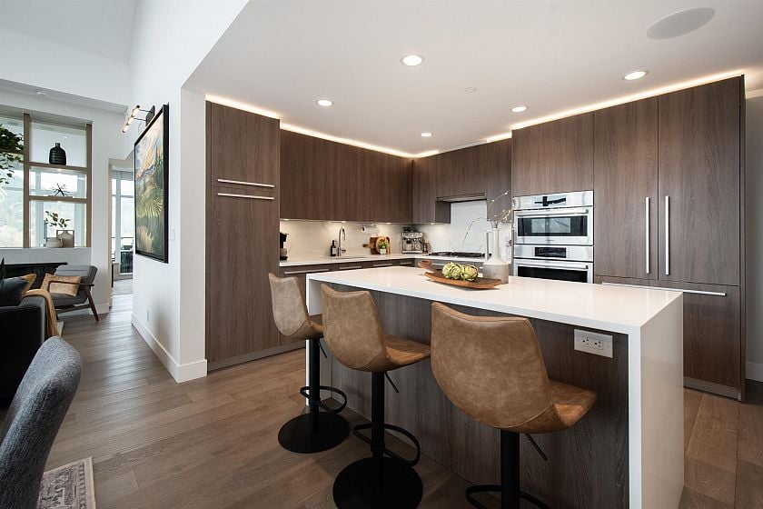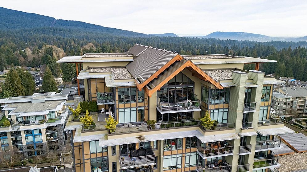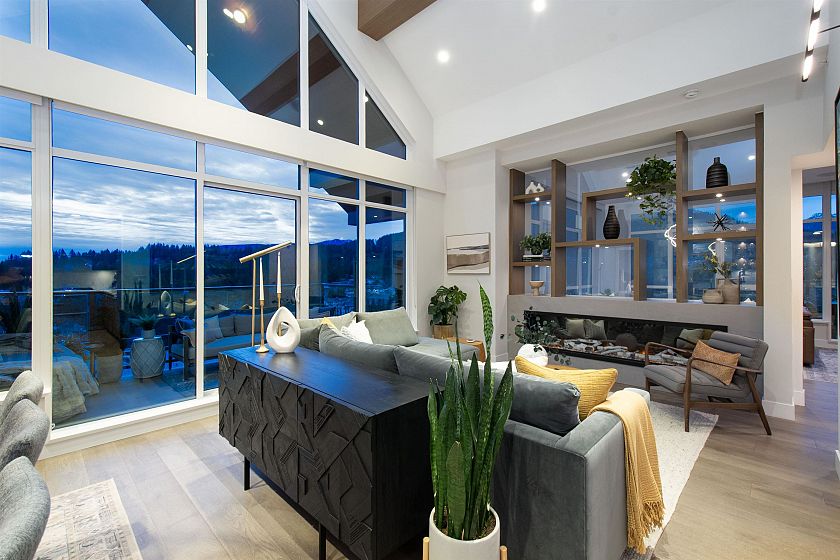 A penthouse defined by architectural presence, and quiet luxury in a prime North Vancouver setting. Vaulted ceilings, architectural beams establish scale & character. The secondary living area is delineated by a linear fireplace and custom smartglass, creating open sight-lines or complete privacy at the touch of a button. The space includes a custom wall bed and desk system, with a media area featuring a drop-down screen and projector for cinema nights. The kitchen integrates seamlessly, supporting daily flow. A custom built-in bed & feature wall anchor the primary bedroom. Built by Bosa and thoughtfully enhanced, the home feels measured and enduring throughout. Set atop The Residences at Lynn Valley, steps to trails, cafés & everyday conveniences, this is design-led living with restraint.