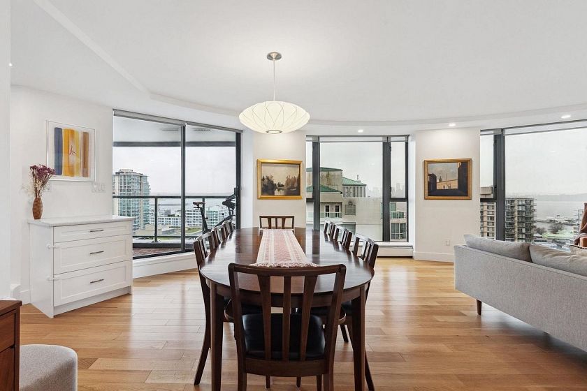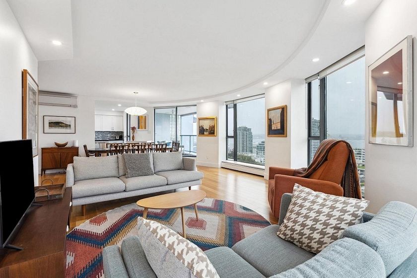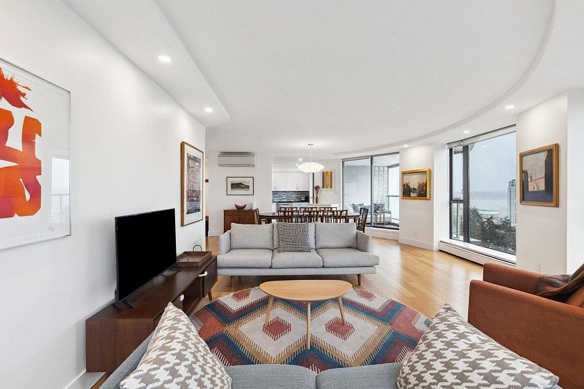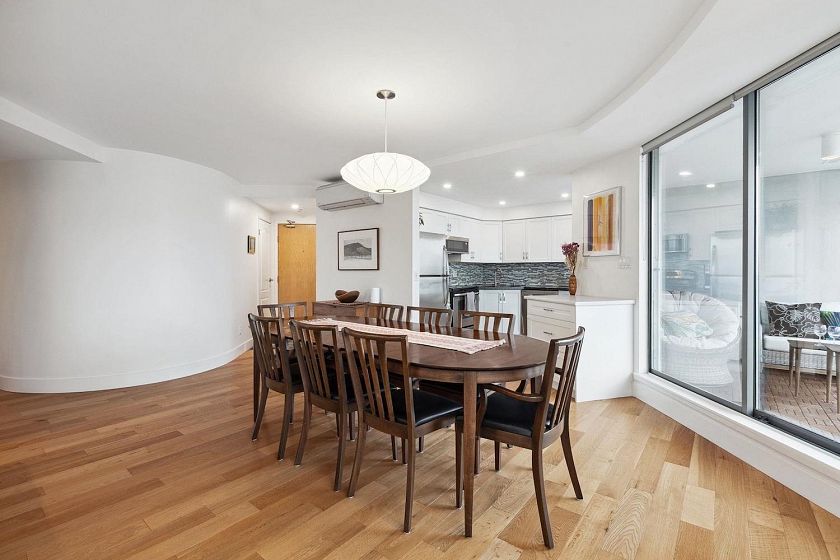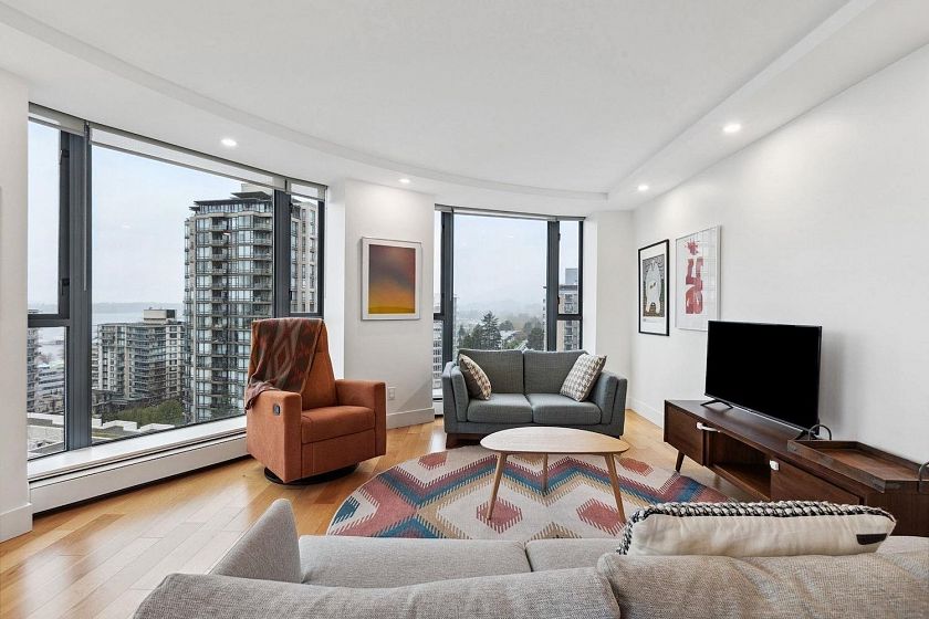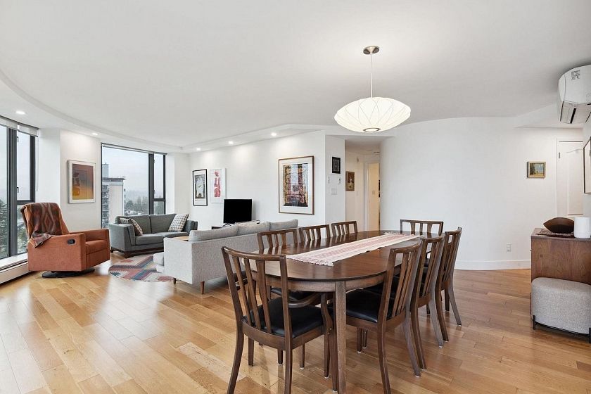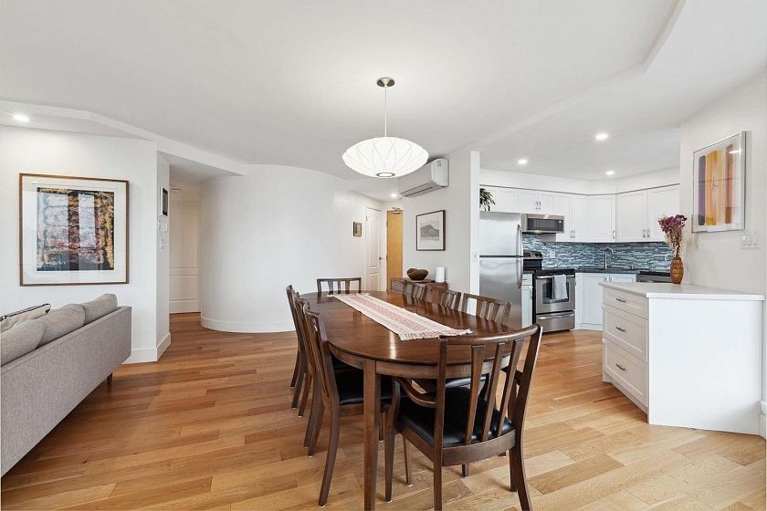 Renovated, spectacular, and right in the heart of Lower Lonsdale! Hop, skip and a jump away from all the action of Lower Lonsdale plus VIEW, VIEW, VIEW! With close to 1200 square feet of open living space, enjoying and entertaining in this 35 year young unit is easy. This spacious even has room for a real dining room table! Other perks include a beautiful updated white kitchen with granite countertops, stainless steel appliances, hardwood floors throughout, in suite laundry, plus AIR CONDITIONING. This incredibly bright south facing unit will tick all the boxes for someone!Two bedrooms side by side including a huge master enjoying its own private en suite bathroom. Relax on your own private deck with enough room for those with a green thumb wanting vegetables or other potted plants.