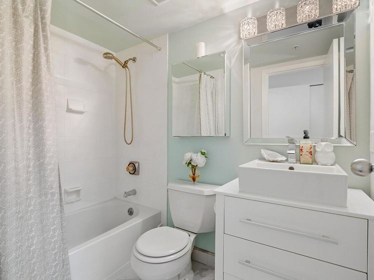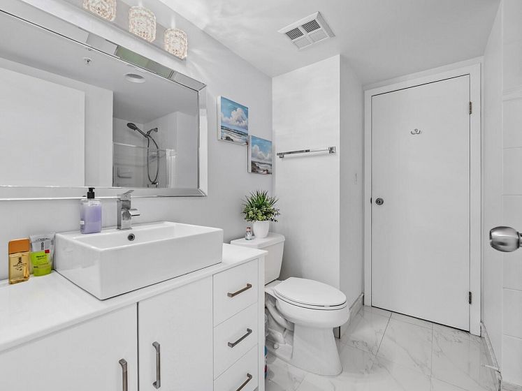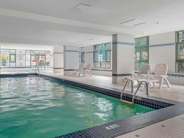 A HOME to take PRIDE in! Absolutely STUNNING renovations in this two bedroom, two full bathroom, corner suite with floor to ceiling WINDOWS GALORE for ULITIMATE light that comes with TWO parking stalls and a GOOD sized locker which is a RARITY in these neck of the woods! From the QUARTZ counters, think wood plank flooring, GORGEOUS ceramic tiles, PERFECT paint, S/S appliances and a list that goes on and on! Suite has an EXCELLENT layout with even such features as the second bathroom acting as a cheater ensuite also. A building in a second to none location with a BEAUTIFUL refreshed lobby and with TOP NOTCH amenities such as an indoor pool, AWESOME gym, sauna, HUGE deck to enjoy in summer and much more! One cat allowed, no dogs and 6 month rental minimum! This HOME has it all!
