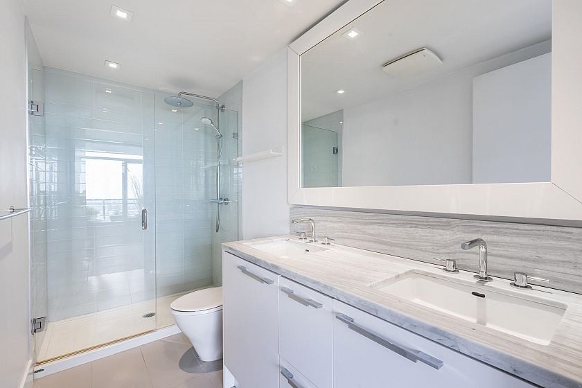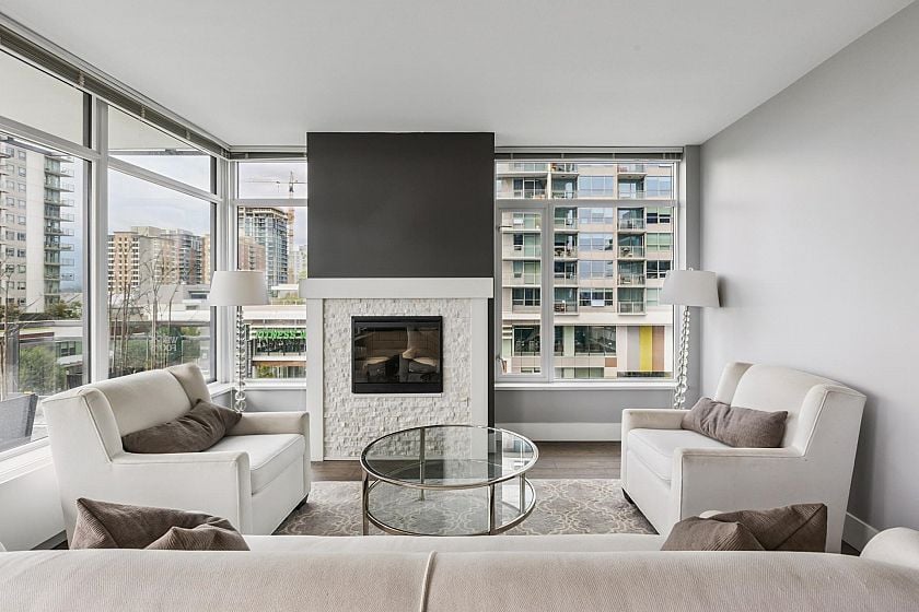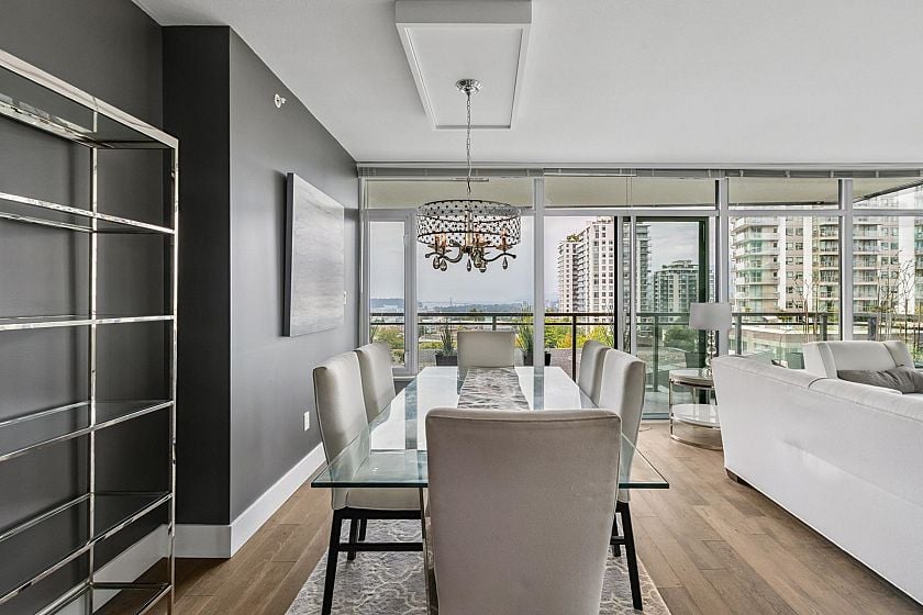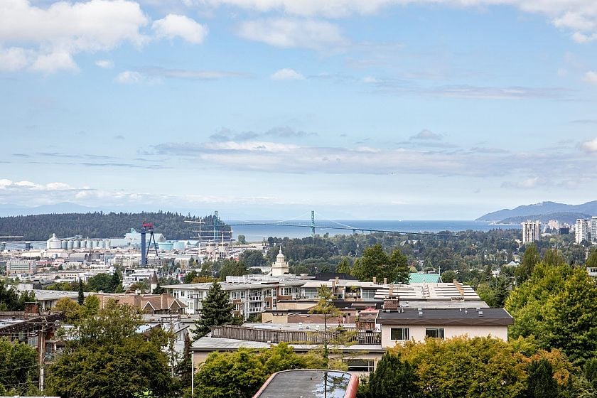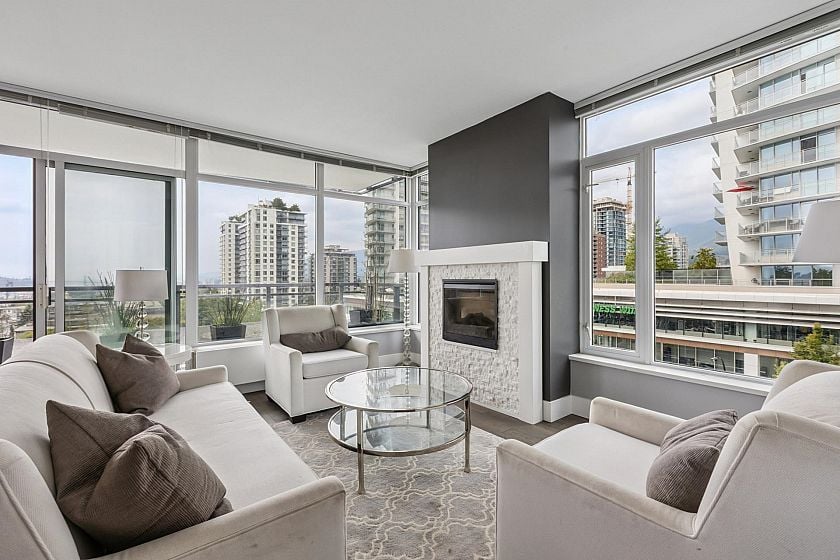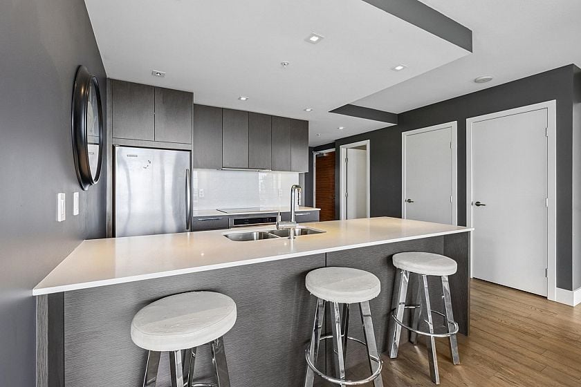 Bright 2-bed, 2-bath corner suite at The Prescott offering 944 sq/ft of interior space and a 244 sq/ft balcony with stunning city, bridge, & mtn views. Located in the heart of Central Lonsdale—steps to Whole Foods, shops, cafes, transit, and more. Floor-to-ceiling windows fill the home with natural light, while the modern kitchen features quartz counters, KitchenAid appliances, and a large peninsula with bar seating. The open living/dining area includes eng. hw floors & an electric fireplace. Bedrooms are well-separated; the primary has a walk-to-wall closet & 4-pce ensuite w/ double sinks. Additional features: guest bath with soaker tub, in-suite laundry, 1 parking, storage, bike room, and access to a gym & dog wash. Well-regarded building in a prime central location.