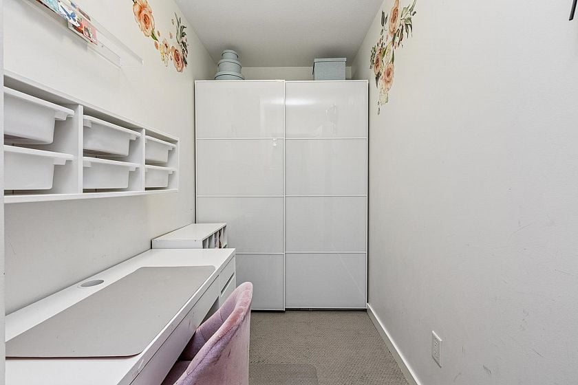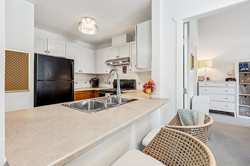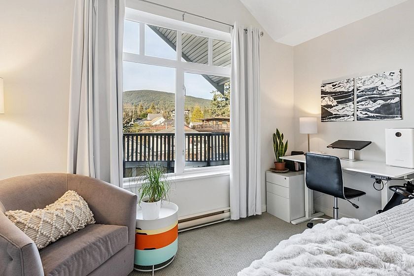 Top-floor 2 bdrm + den with over 1,000 sq/ft incl an open-concept kitchen, dining, and living area - ideal for everyday living and entertaining. The living room features a cozy fireplace, large picture windows, and access to a covered balcony perfect for year round use. The kitchen includes two-tone cabinetry, a recently upgraded dishwasher, and a breakfast bar. Bedrooms are well-separated for privacy; the primary boasts 15-ft vaulted ceilings, two closets, space for a seating or work area, and a 4-piece ensuite. The den has a built-in closet and can serve as storage, pantry, or home office. Located in Central Lonsdale (Walk Score 86), steps to shops, cafés, parks, transit, the upcoming Harry Jerome Recreation Centre. A well-balanced blend of space, views, and walkable convenience.