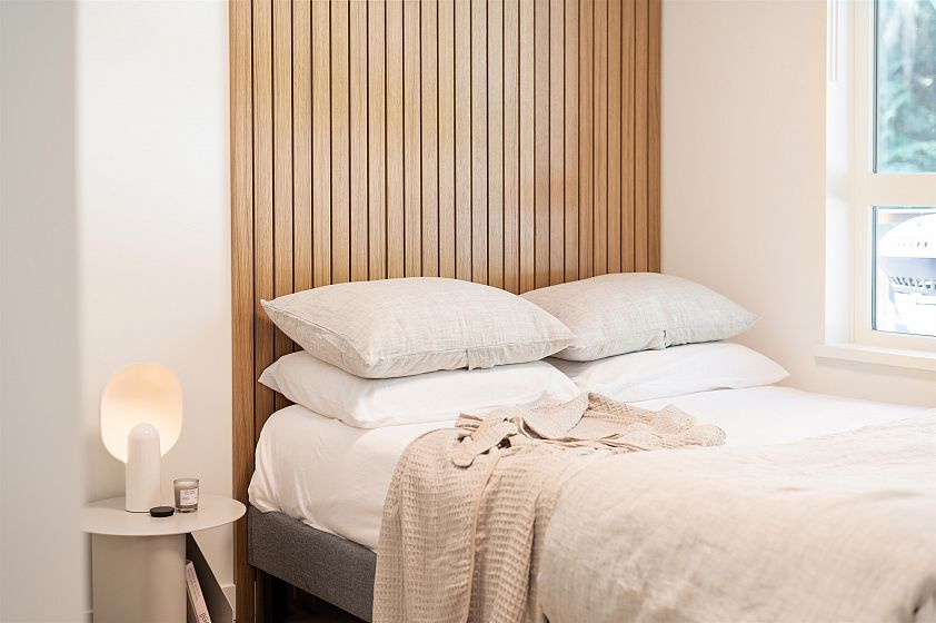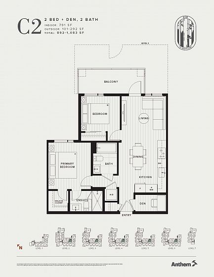 This north-east facing 2 bed + den, 2 bath condo offers a functional layout, airy 9' ceilings, contemporary L-shaped kitchen with pantry, induction glass cooktop and dining area. The living space opens to an expansive 292 SF balcony for seamless indoor-outdoor flow. The primary bedroom fits a king with a walk-in closet and ensuite, while the second bedroom comfortably a queen. The den provides flexible space for a home office or extra storage. Set within the Yew collection at Baden Park by Anthem, a 6.25-acre master-planned community at Lytton Street & Mt. Seymour Parkway in North Vancouver. Enjoy being steps from Ron Andrews Rec Centre and minutes to trails, Deep Cove, Mt. Seymour, schools and major highways. Visit us at 104-948 Lytton Street. By appointment only.
