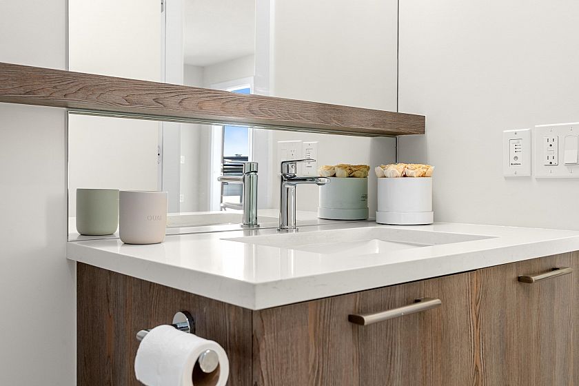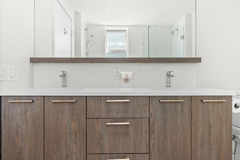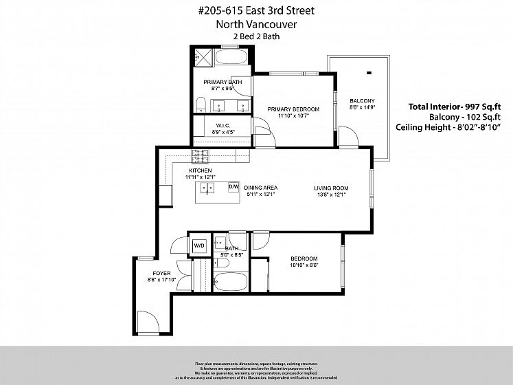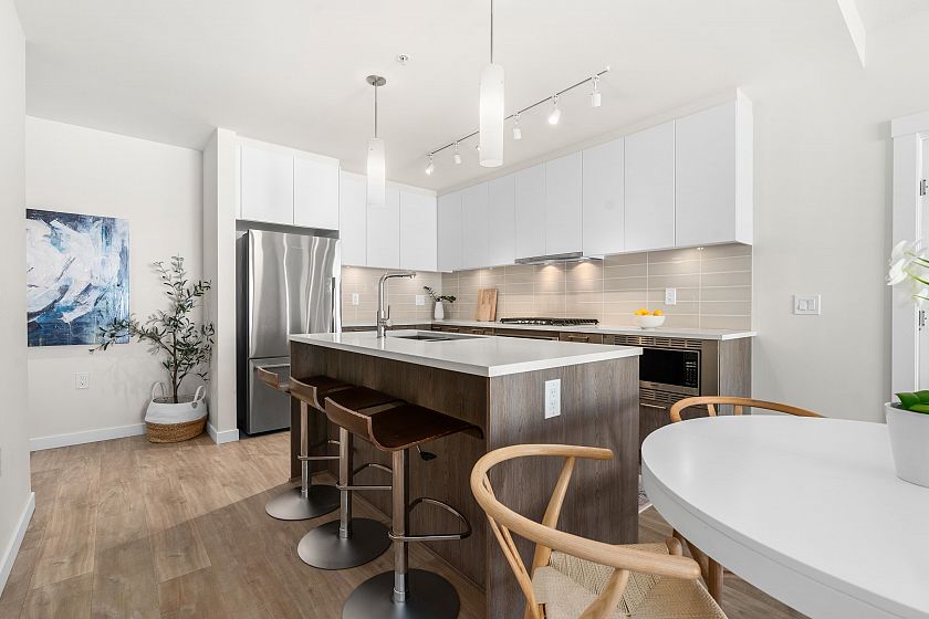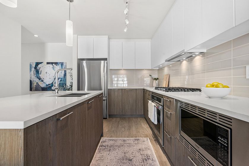 Unlike many 2-bed, 2-bath homes, Unit 205 welcomes you with a true foyer with space for strollers, bikes & a full hall closet. Bedrooms are thoughtfully laid out on opposite sides for privacy, both with custom California Closets. Southwest exposure fills the home with natural light, and its unique positioning offers a quiet, top-floor feel. Features include 2 parking stalls, a modern kitchen designed for everyday living & entertaining, a storage locker & spacious balcony. Just 7 years old, Kindred is steps to Moodyville Park, breweries, the Spirit Trail & Kinderbees Daycare, and close to Park & Tilford and Lower Lonsdale. Smart design, rare privacy, and unbeatable walkability, this is Moodyville living done right.
