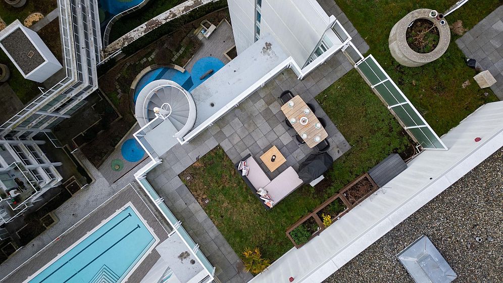 Experience luxury PENTHOUSE living at Kensington Gardens. This 2bed + den home offers a PRIVATE ROOFTOP PATIO with sweeping SW views facing quiet side plus TWO additional patios (off kitchen & primary). Newly upgraded with a kitchen renovation, expanded laundry with new LG machines, custom blackout blinds. Enjoy 9’5” ceilings, A/C, Miele appliances, oak floors, and floor-to-ceiling windows. Includes 1 parking (extra available $120/mo), 2 rentable storage lockers, easy street parking and rooftop landscaping maintained. Resort amenities: pool, hot tub, gym, theatre & lounge. Steps to T&T Supermarket and plenty of food. Short drive to Downtown Vancouver.