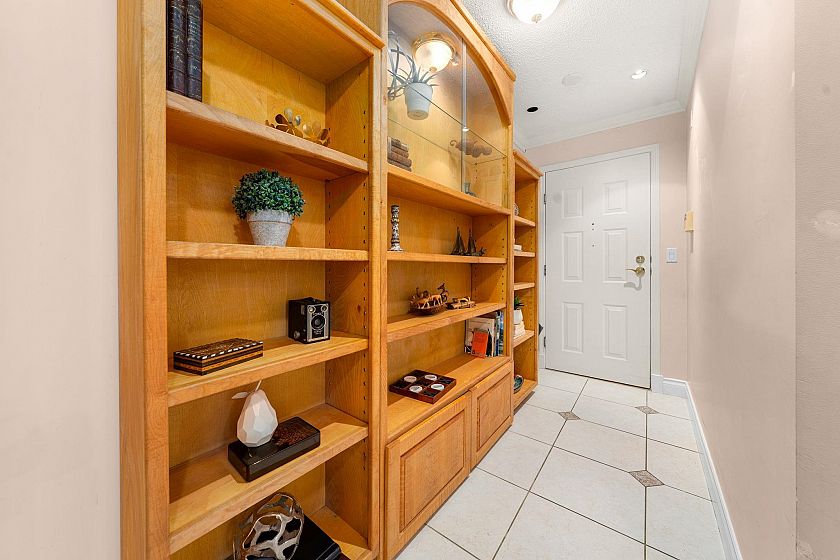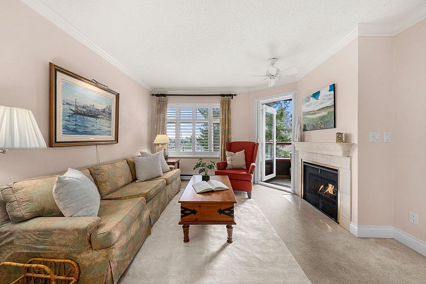 Enjoy a sunny, southwest garden outlook in this rarely available 2 bedroom + den home offering nearly 1,200 sq.ft. of comfortable, house-sized living in a well-maintained 55+ community. Quietly positioned for privacy with treed outlooks from every rooms, this home features generous principal rooms to easily accommodate full-size furniture, perfect for gatherings w/ friends & loved ones. The open kitchen with passthrough to the dining area creates a functional, connected layout for everyday living. Lovingly cared for by a long-time owner. Fully rainscreened building w/ an indoor pool, hot tub, gym, workshop, craft room, library, guest suite & on-site caretaker. Steps to bus stop, Queensdale market & short walk to Harry Jerome Community/Senior center.