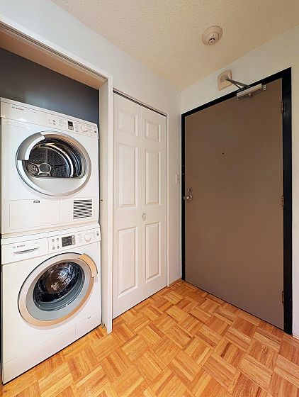 Move right into this updated 832 sqft corner unit in the heart of Lower Lonsdale. With two side exposures, enjoy abundant natural light and refreshing cross-breezes all summer long. The rare 211 sqft wraparound balcony is surrounded by greenery - private, quiet, and perfect for relaxing. Freshly painted with hardwood floors, generous room sizes, and in-suite newer Bosch washer/dryer. Easy ground-level access- ideal for seniors with no elevator required - and conveniently located near the building's secondary exit with two-way access. Includes secure parking and locker. Proactive Strata management. Close to shops, dining, waterfront, and minutes to North-Shore Mountain.