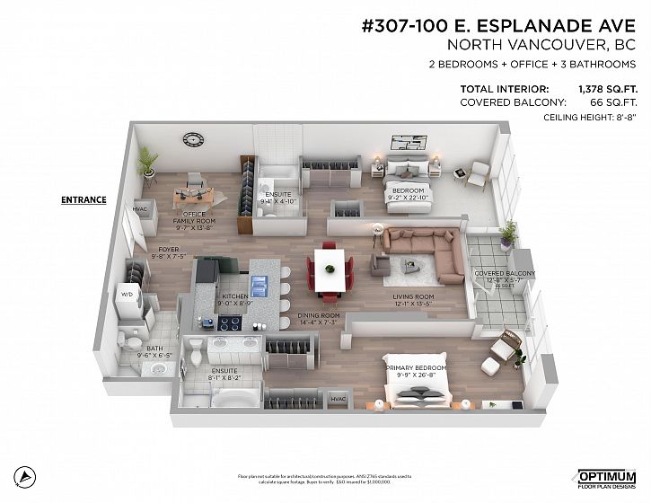 A rare LIVE/WORK opportunity at The Landing at the Pier, a boutique concrete residence in the heart of Lower Lonsdale. Spanning 1,378 sq.ft, this 2 bedroom, 3 bathroom city home offers a rare blend of scale and flexibility with zoning that permits both residential and commercial use. Thoughtfully designed with house-sized proportions, this suite features two oversized bedrooms (both with ensuites) and a flexible office, studio space or formal dining room at the entry. Enjoy south-facing exposure, peek-a-boo harbour views, an abundance of natural light and AIR CONDITIONING. Complete with rooftop patio & 1 secure parking. A prime LoLo location just steps to the Shipyards, Seabus, Quay Market. Virtually staged. OPEN SAT, March 14th 1-2pm or by apt.