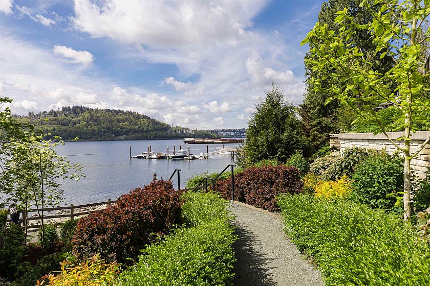 WATERFRONT, near Deep Cove, CATES LANDING by Polygon. Spacious 2 bed 2 bath south facing condo with ocean views, AC, EV parking (2 stalls) and over 1090 sq ft.. Watch eagles soar from your covered balcony w/gas BBQ. Open concept living area, top of the line appliances, large island, spa-inspired baths, radiant-in-floor heat, full size in-suite laundry and large storage locker. Walk along the waterfront trail directly to Cates Park then enjoy the various amenities including a large fitness room, guest suite, bike room, kayak storage, dog wash, meeting rooms and on-site building manager. FREEHOLD STRATA, pet & rental friendly. Restaurants, transit, shops and more close by. Open by Appointment.
