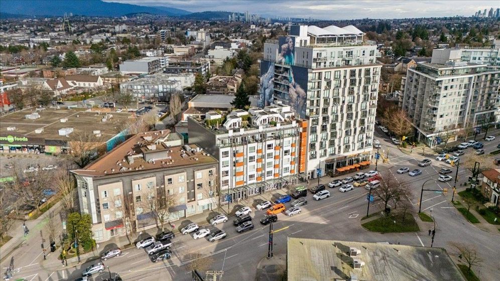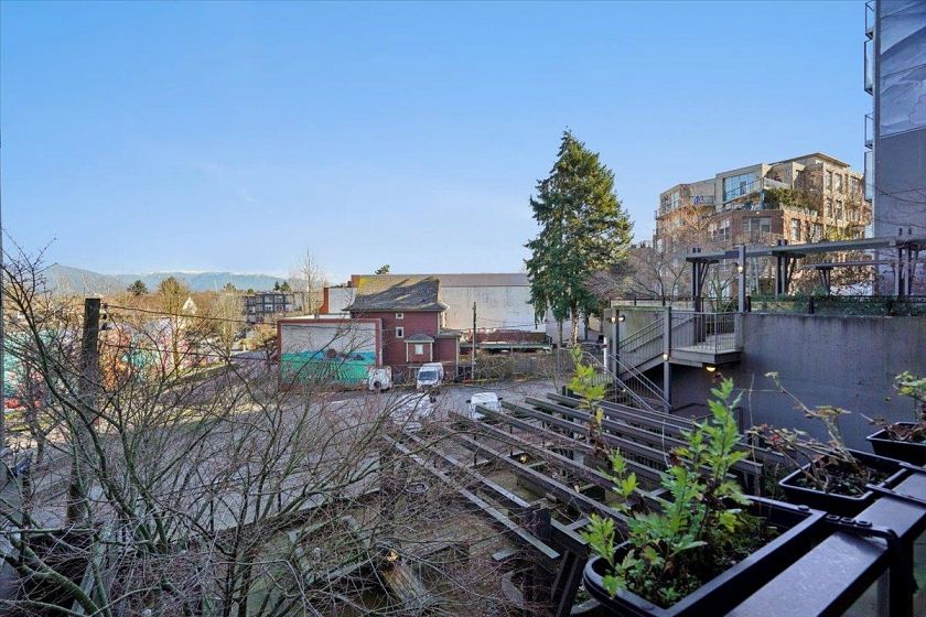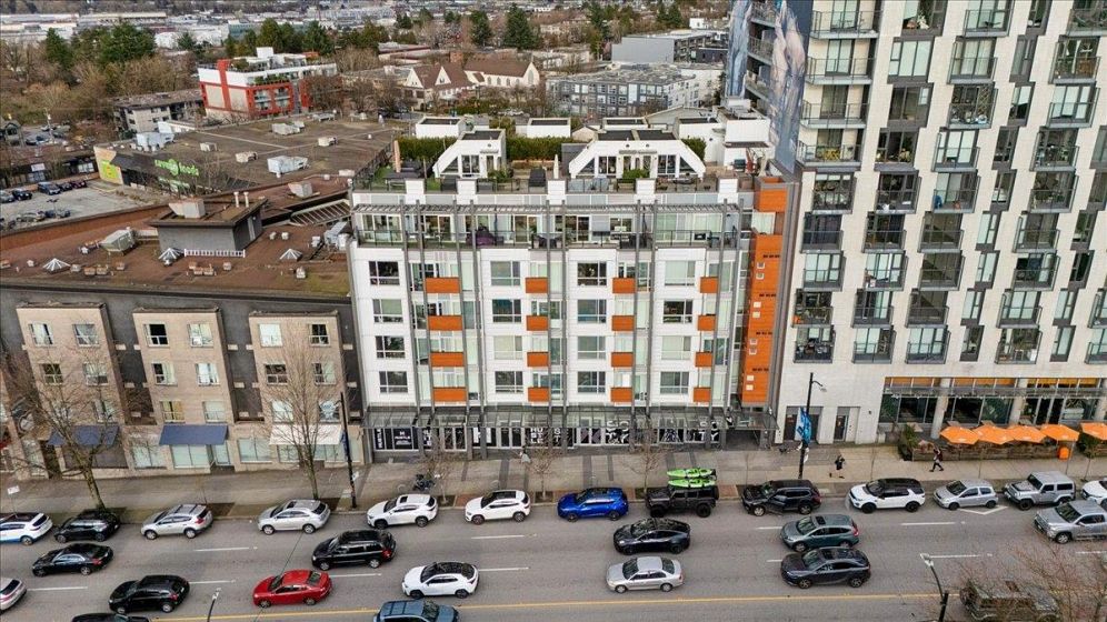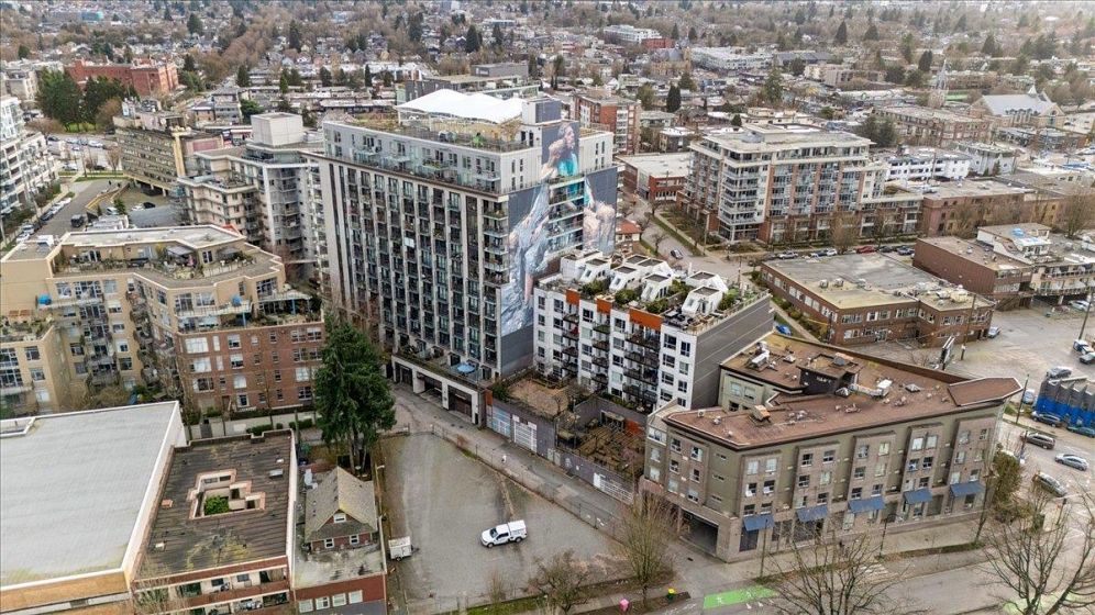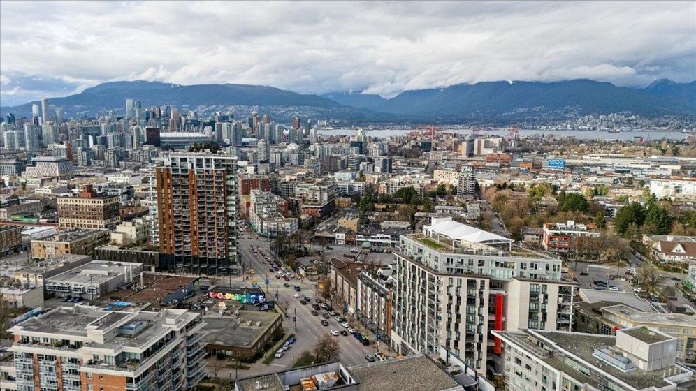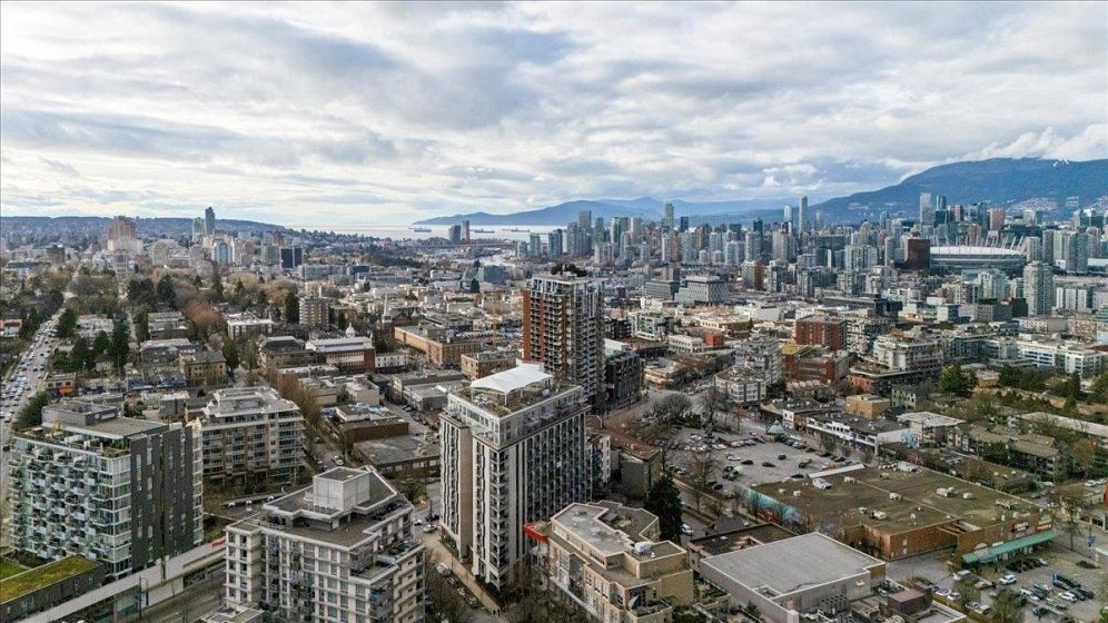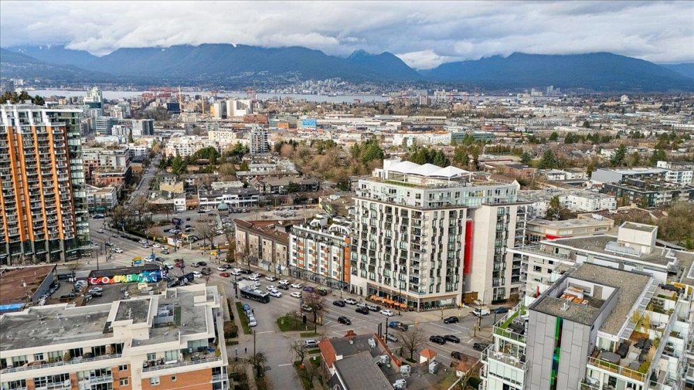 Welcome to Vya by PortLiving in vibrant Mt Pleasant! This 955 SF, 2 bed, 2 bath home (built 2017) is on the quiet side & offers a smart layout w/1 den + office + insuite storage/pantry. Gourmet kitchen w/ quartz counters, glass tile backsplash, ample storage & full-size Fisher & Paykel + KitchenAid S/S appliances. Primary bdrm feat. walk-thru closet w/custom built-ins & spa-inspired ensuite. Hardwood floors + smart lighting, thermostats & blinds. 222 SF elevated patio fits lounge, BBQ & dining set w/ North Shore mtn views. Very well-maintained, pet-friendly building w/ 2 landscaped terraces, fire pit & BBQ. Steps to shops, cafes & future Main–Broadway Station. School catchment: F.Nightingale Elem, C.Tupper Sec., French Immersion Van.Tech.Sec. 1parking+2lockers. OH: Sunday, March 8, 2-4 PM.