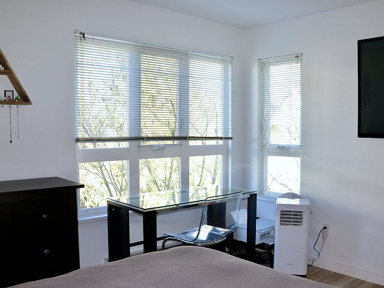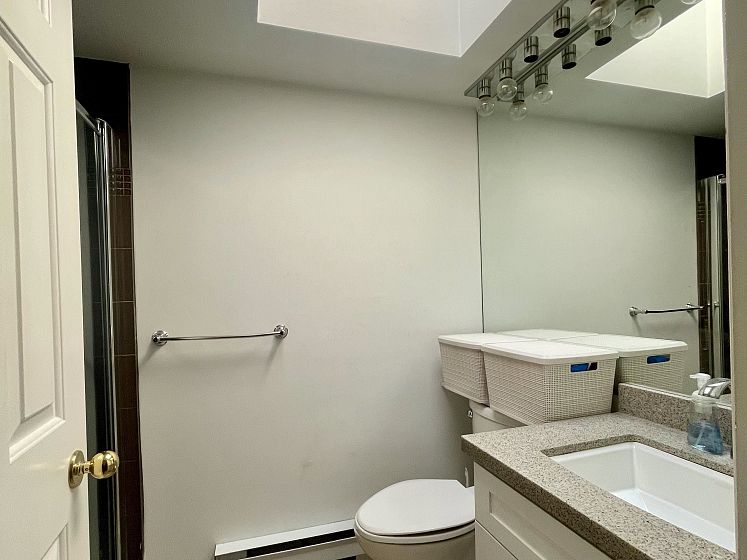 Perched above it all, this stunning penthouse showcases soaring vaulted ceilings bathed in natural light from dual sets of clerestory windows, three skylights — one in the entry, one in each bathroom — and corner kitchen windows that frame the sky on two sides. The fireplace with its two glass sides anchors the living space with warmth and style, while newly installed floors keep it fresh. Peek-a-boo southern views add a playful charm to this corner unit. Come on over and take a look
