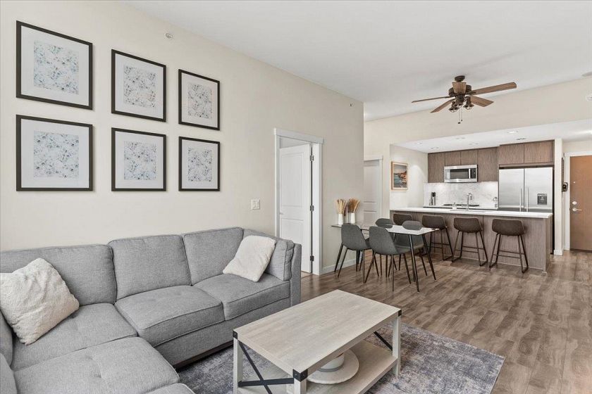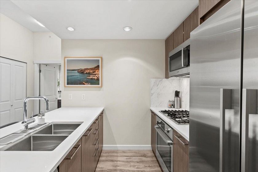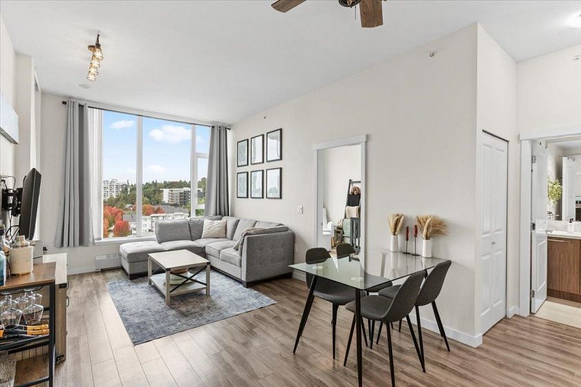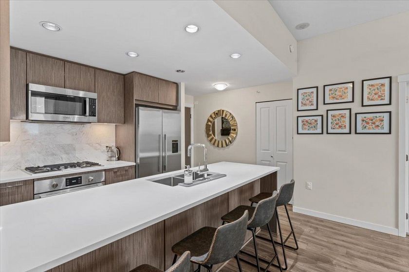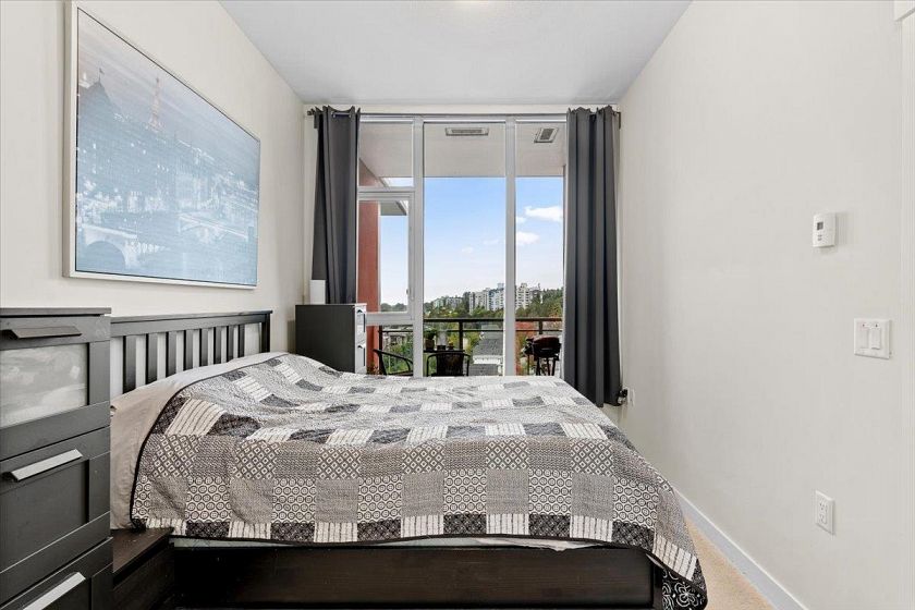 SUB PENTHOUSE VIEWS in this 2 Bed + Den at Rhythm by Polygon. The 1O' ceilings and unobstructed west-facing views of the Fraser River make for great sunsets on the balcony. Bright, open layout with separated bedrooms, modern kitchen with quartz counters, s/s appliances, and ample storage. The den makes an ideal office, nursery, or storage/pantry. Enjoy top-tier amenities at Rhythm Club: A/C fitness centre, lounge, meeting room, and courtyard. Kid-friendly community steps to parks, playgrounds, Fraser River Trail, and 2 blocks from River District Town Centre. 1 parking, 1 locker. Easy access to Burnaby, Richmond & New West. OPEN HOUSE SATURDAY, MARCH 14th, 11:00AM-1:00PM.