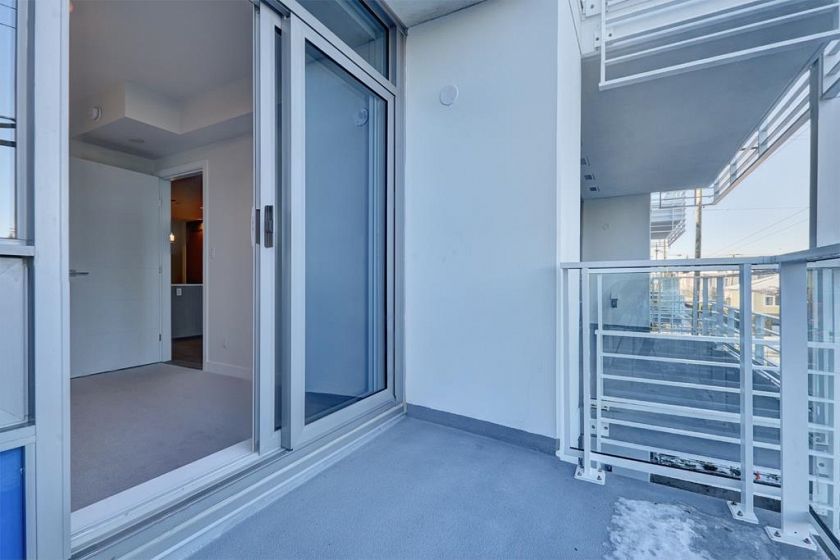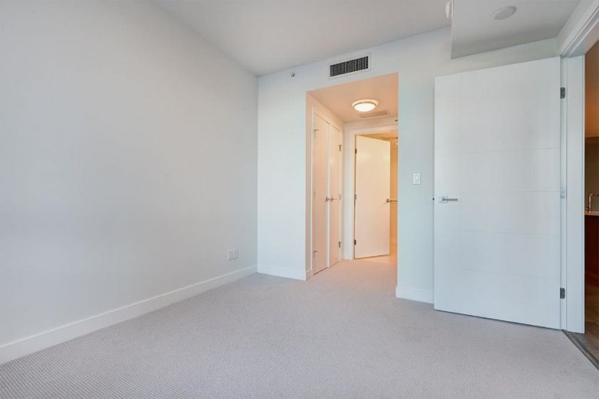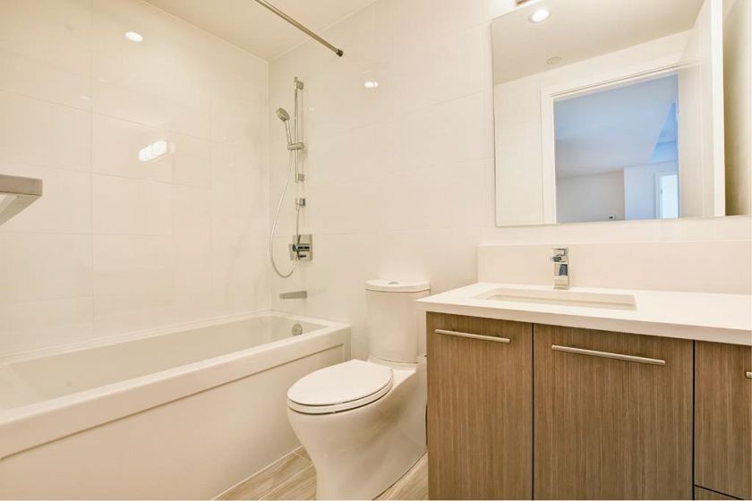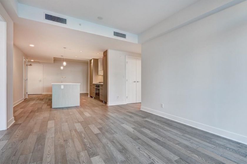 This 1025sf, 2-bed+den condo boasts a unique layout, featuring a spacious family room leading to a large living area with a modern gourmet kitchen at its center. Highlights include 9' ceilings, central air, hardwood floors, and roller blinds. The living room opens to a sizable balcony. The kitchen offers wood-grain laminate cabinetry, quartz countertops, and high-end Miele appliances. The primary suite spans one side with a bedroom, private balcony, walk-through closets, and a luxurious 5 pcs ensuite. The 2nd bedroom, 2nd bathroom, and in-suite laundry occupy the opposite side. Both bathrooms showcase wood-grain cabinets, quartz countertops, porcelain tiles, and Kohler fixtures. A small den in the family room serves as an office. Rent includes 1 parking stall and 1 storage locker.