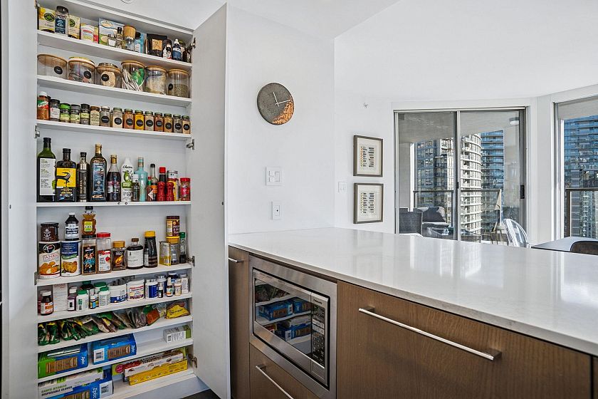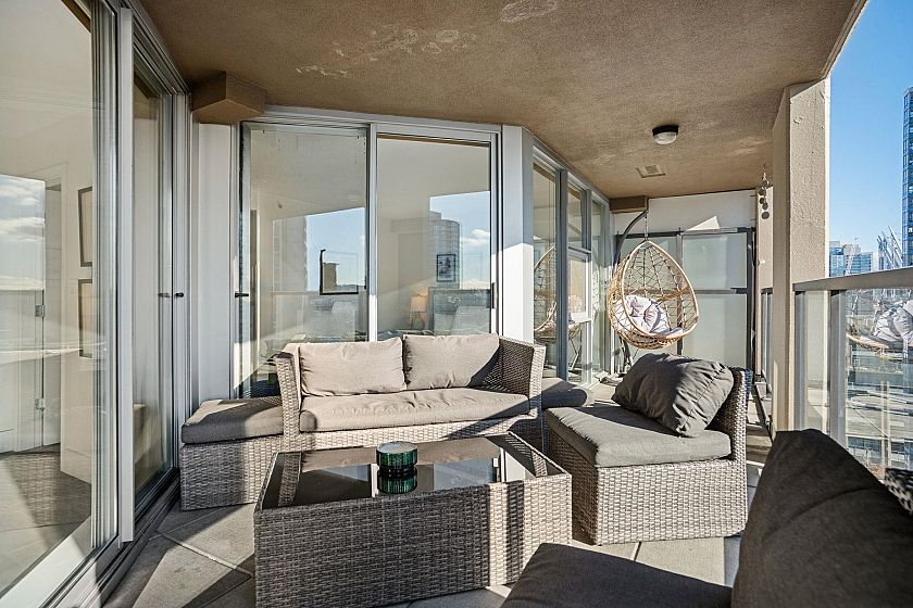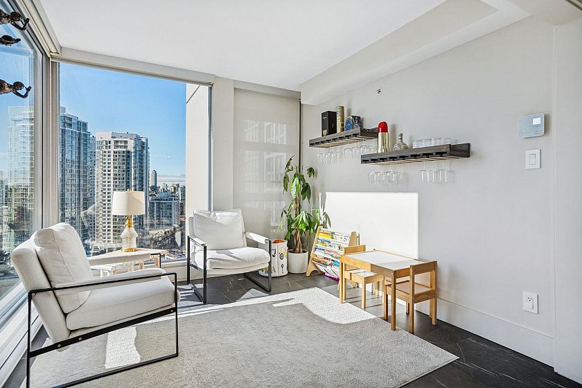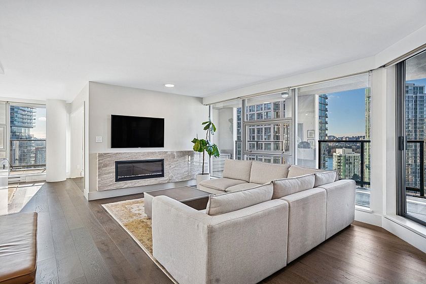Welcome to Nova by Bosa Properties _ a rare fully renovated 1,308 sq ft corner 2 bed, 2 bath + den offering over 400 sq ft of outdoor space across two covered large balconies with stunning water and city views. A smart, no-wasted-space layout enhances everyday living. The designer renovation features a gourmet kitchen with premium Gaggenau appliances, custom cabinetry, engineered flooring, spa like bathrooms, roller blinds, tailored closets, and much more. Quality concrete construction in an unbeatable location, steps to the best of Yaletown, the Seawall, parks and marina. Amenities include a gym, jacuzzi, elegant lobby, party room, and a guest suite. Includes 2 parking stalls & 1 locker — a rare turnkey opportunity in the heart of Yaletown.