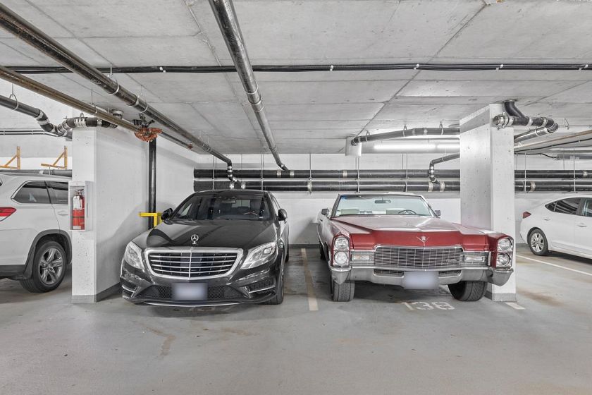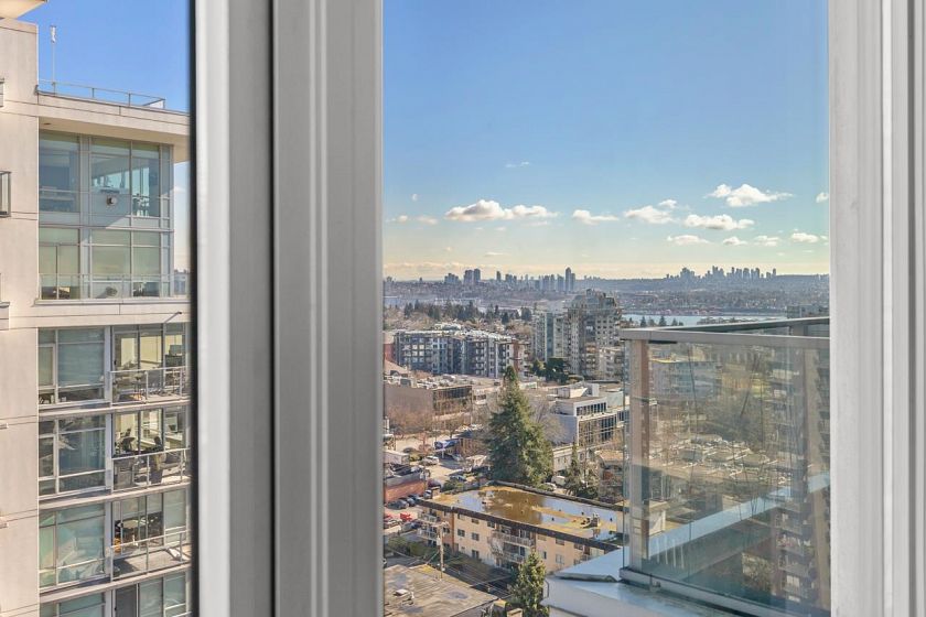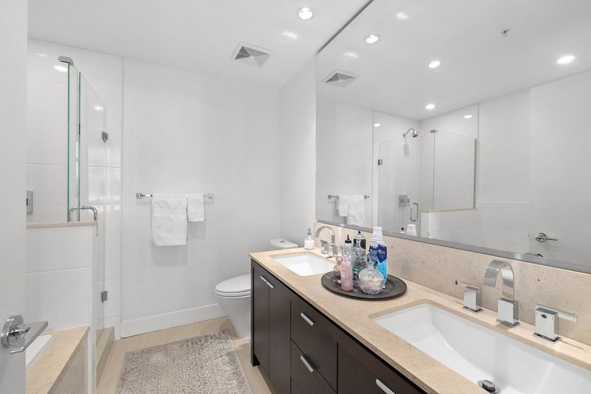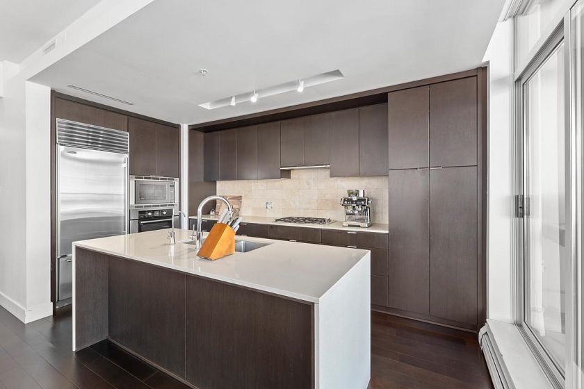 Rarely available SUB-PENTHOUSE corner residence offering 1232 sq.ft of expansive, house-sized living with sweeping 270° mountain & partial city/harbour views. This thoughtful layout begins with a true foyer, creating separation between the main living areas and private bedroom wing. The open-concept living and dining spaces are designed for full-size furnishings and flow seamlessly to an oversized, wide balcony positioned above neighbouring buildings - providing exceptional privacy and serene views towards the Lions & NShore Mountains. The well-appointed kitchen anchors the home with an entertainer's island, sub zero fridge and ample cabinetry. Complete with 2 side-by-side parking, 1 storage locker & fitness centre. Tenanted property: showings with notice by appointment