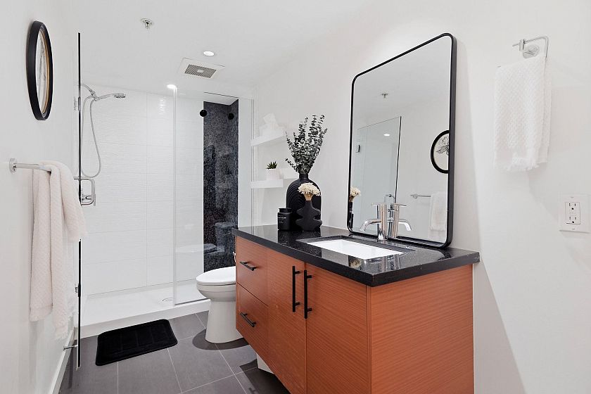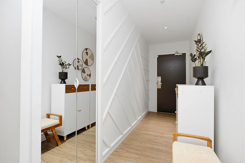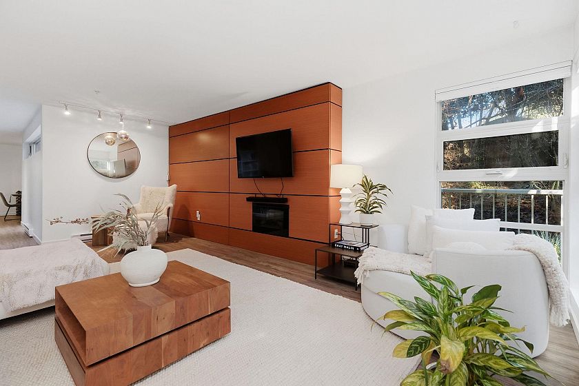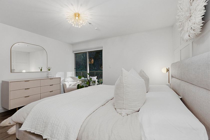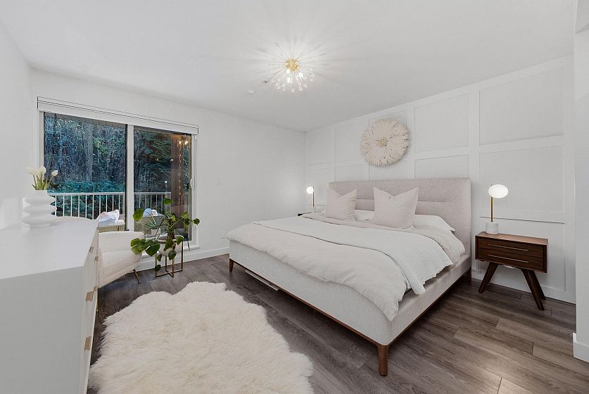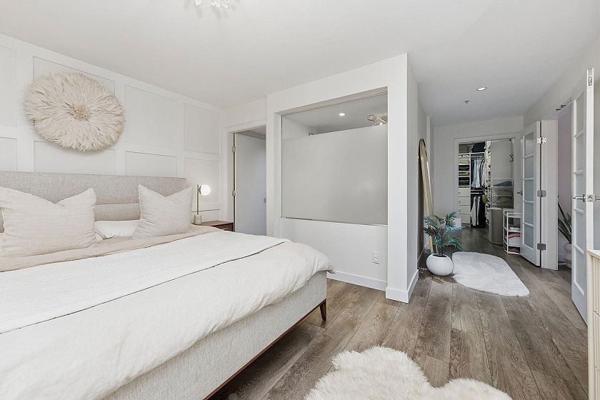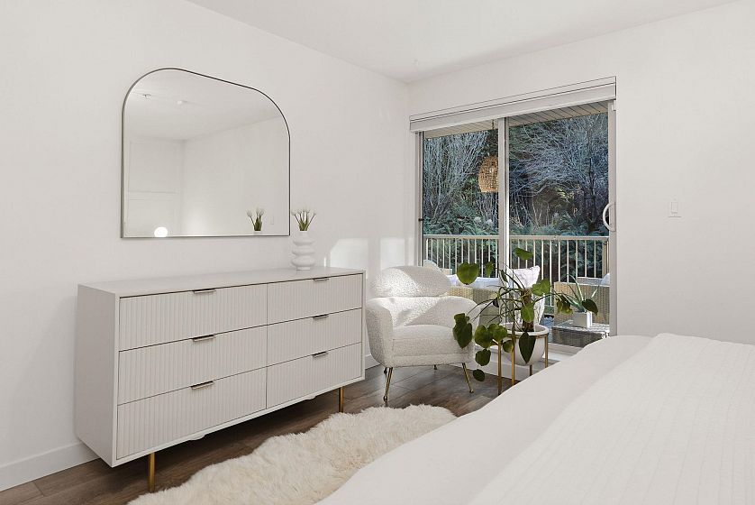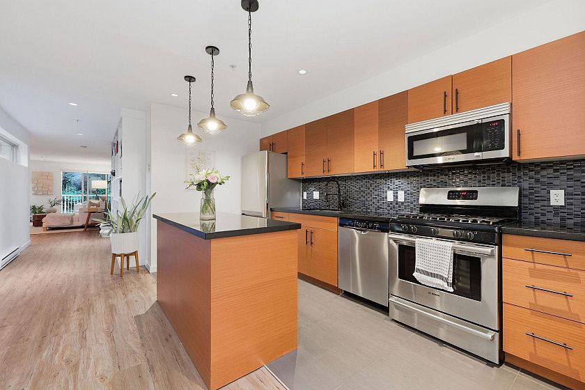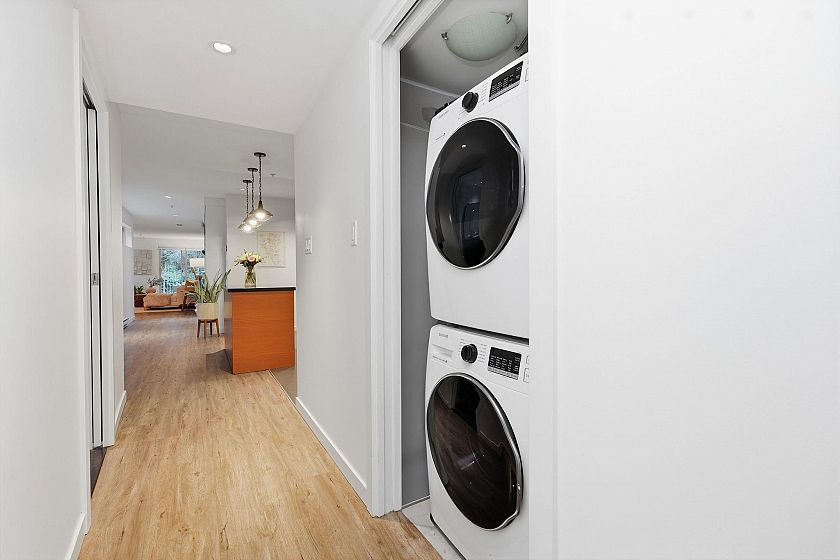 In an intimate community of just 14 homes, this beautifully maintained 1 level home offers privacy, great style & effortless living. Occupying the entire NE corner of the 1st floor, it offers a contemporary kitchen with warm wood cabinetry, stone counters, s/s appliances and a seamless flow into generous living & dining areas. Standout features are a sumptuous primary suite & 2 expansive covered patios; a true extension of the living space — ideal for outdoor dining & quiet afternoons - framed by a bright green space. Enjoy morning light on the patio & afternoon sun across the garden in the summer. Easy one-level access, two side-by-side parking stalls in a secure underground garage, an oversized storage locker & your 4-legged friends are welcome here! Located with quick access to transit