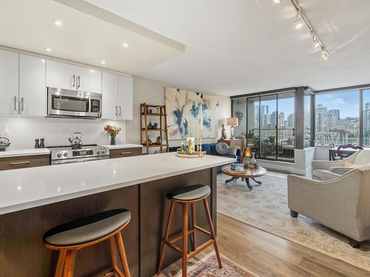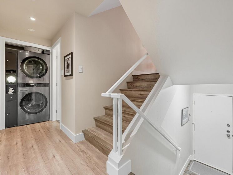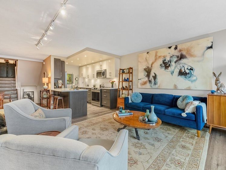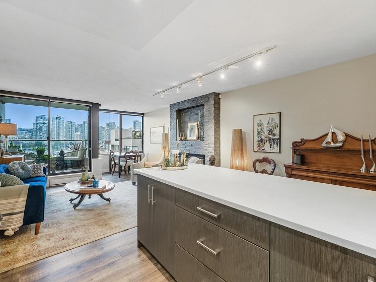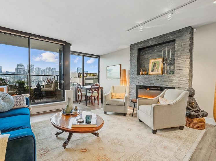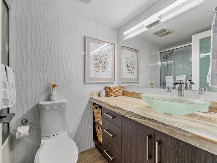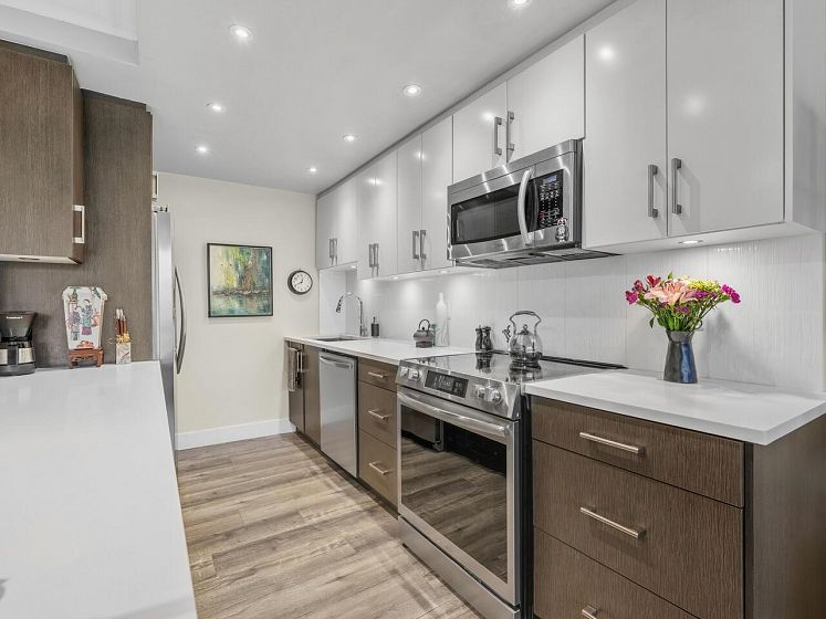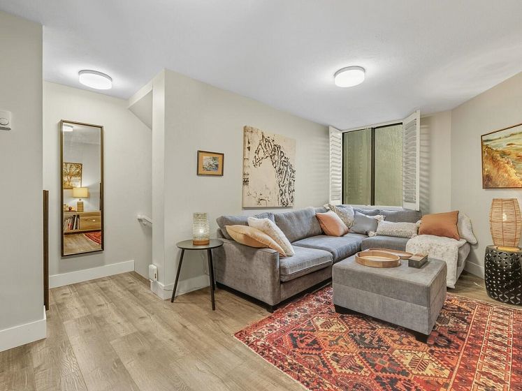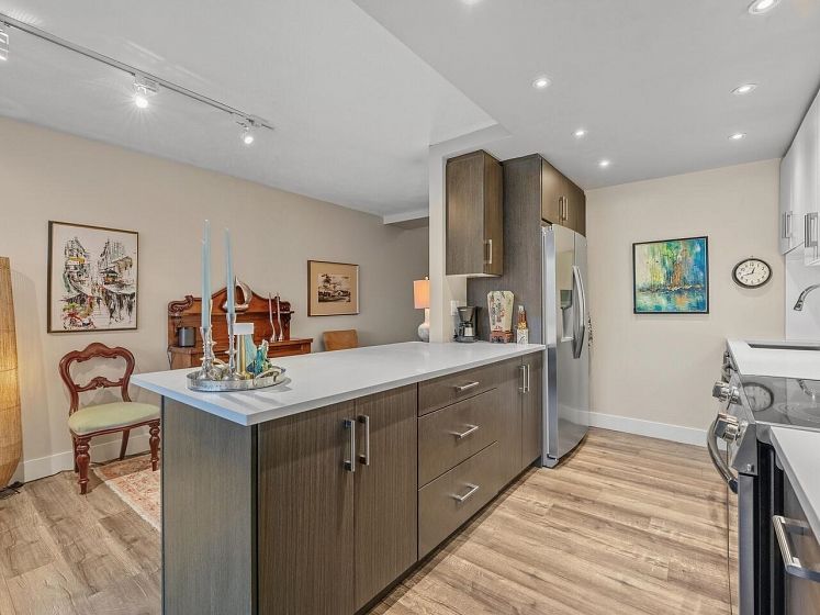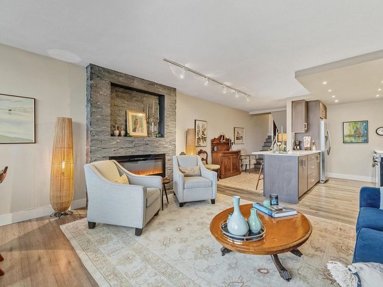 False Creek - Waterfront and Absolutely Stunning! Million Dollar View and Three Storeys of beautifully laid out, and fully renovated space. With two generous bedrooms, open concept living, dining, and kitchen, plus a spacious family room (can be converted to a third bedroom). Gorgeous vinyl plank flooring, new high gloss kitchen cabinets, quartz countertop, contemporary lighting, and renovated bathroom, new appliances - nothing to do but move in. Relax by your cozy stone fireplace in the winter and on your covered patio in the summer. Includes parking and storage room outside the door, with a second locker, pets and rentals allowed. Very well maintained complex with a diligent strata and healthy contingency fund. Prepaid Lease to 2056.