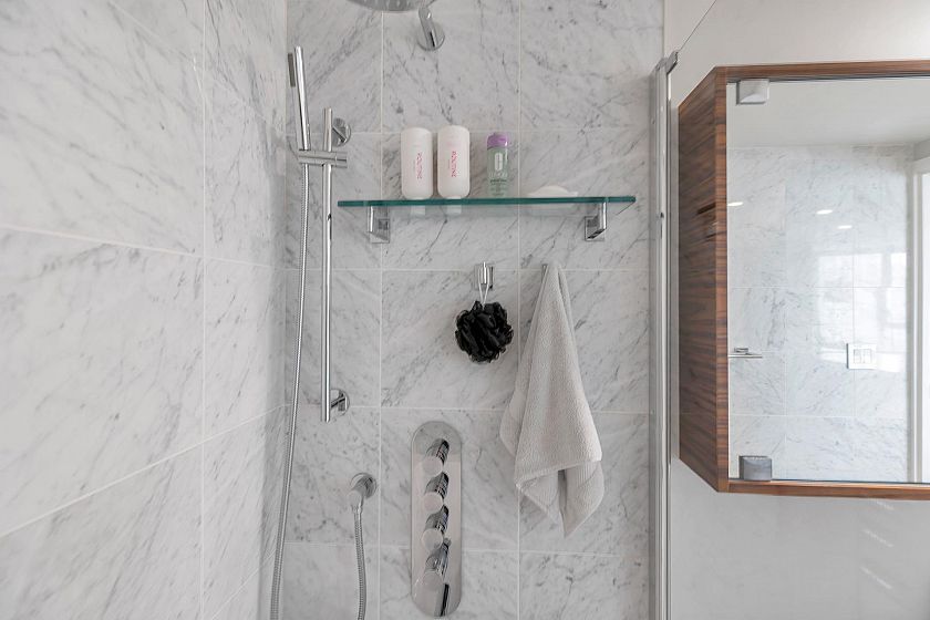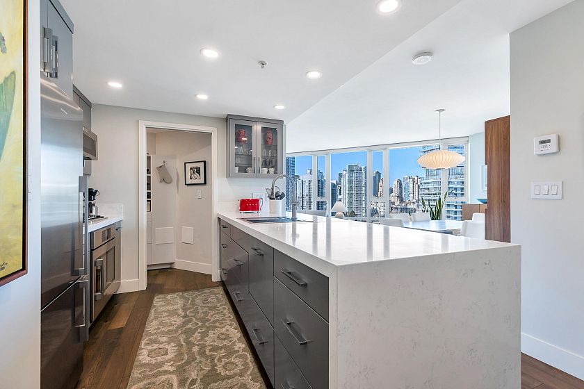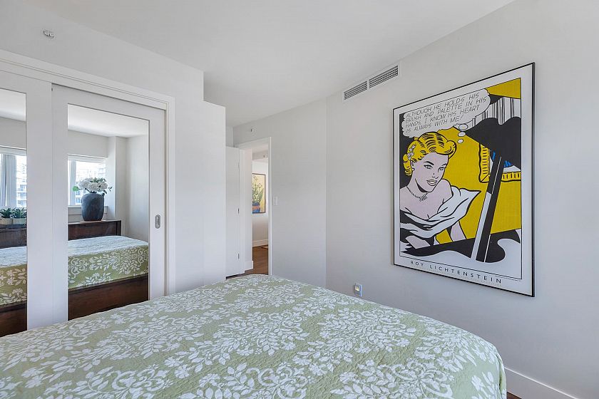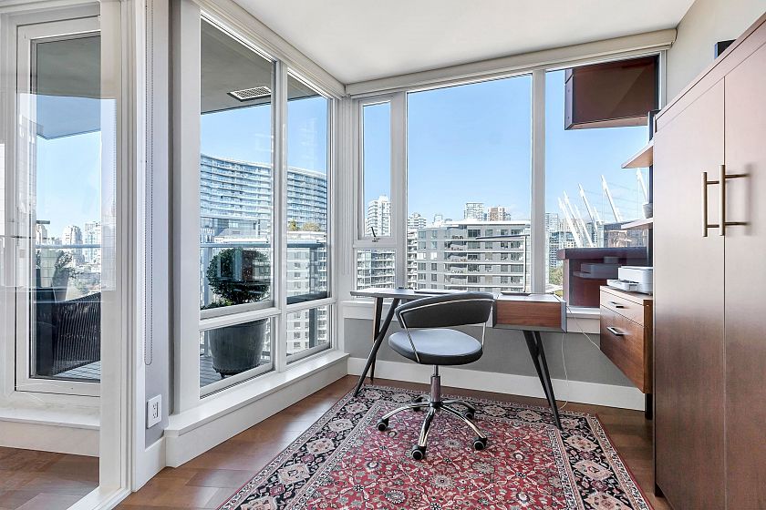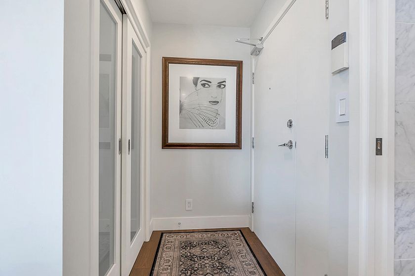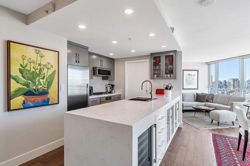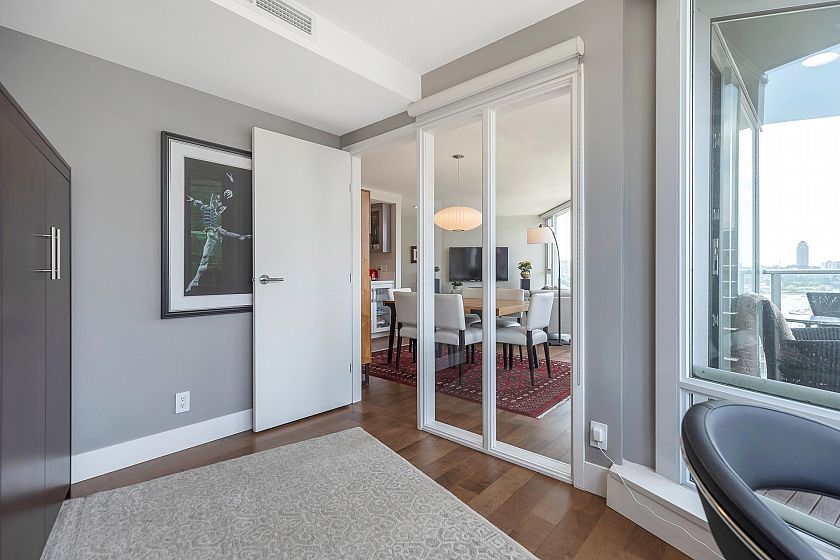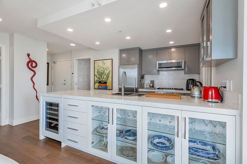 EXECUTIVE 2 bed home fully renovated to exacting standards, waterviews and aircondition! Every nook of this home has been thoughtfully upgraded, and optimized for storage. Massive kitchen with modern matte grey cabinetry and waterfall quartz countertops. Dual drawer integrated DW & winefridge and highend appliances. Spacious living/dining area opens to patio with views of the marina and sky line. Large primary with additional built in closets/organizers. SPA bath with JETTED tub, marble tile, and walnut vanity. Extra large den could easily be a 2nd bedroom. Excellent amenities include a concierge, pool, gym, bowling alley, and movie theatre.
