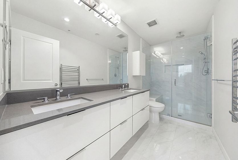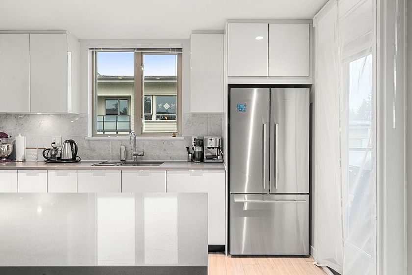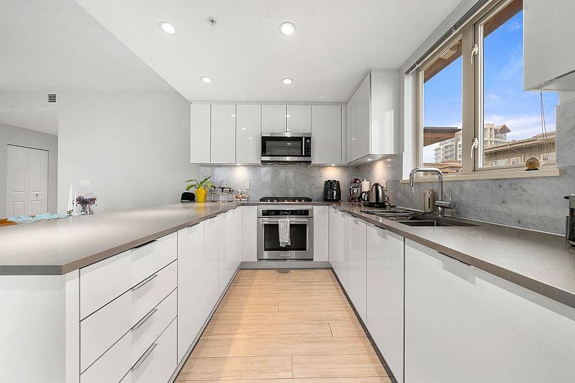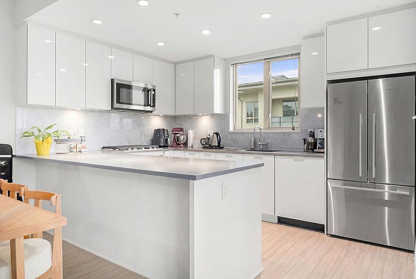 Beautiful top-floor 2 bed, 2 bath condo in the heart of Lynn Valley with sweeping mountain views and a private deck. Soaring ceilings and a smart, open layout create a bright and spacious feel throughout. The kitchen features quartz countertops, marble backsplash, and premium KitchenAid & Fisher & Paykel stainless steel appliances, flowing seamlessly into the living and dining areas perfect for everyday living and entertaining. Building amenities include EV charging and a convenient dog wash station. Includes 2 parking stalls. Steps to Lynn Valley Centre, parks, hiking and biking trails, transit, and close to top-rated schools.