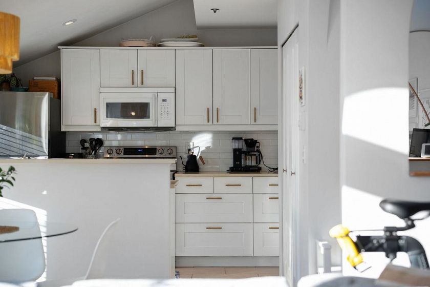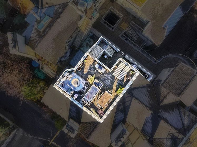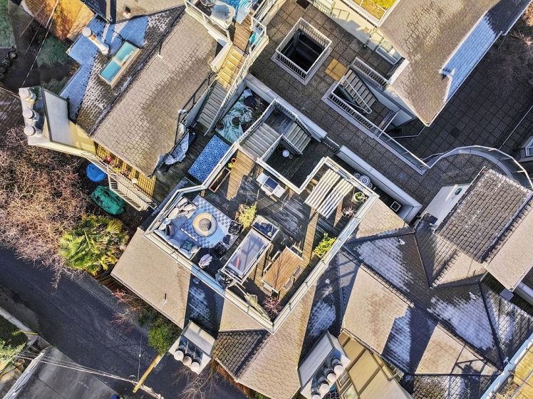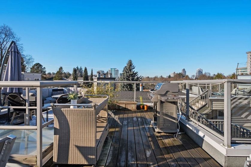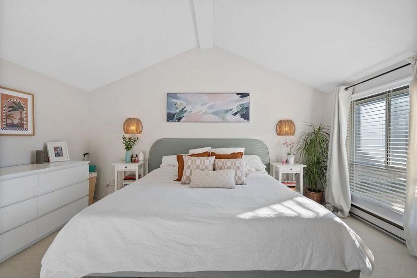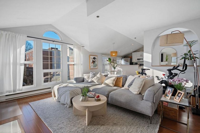 Rarely available, penthouse with over 500+sqft of outdoor space including rooftop patio! Bright 2 bed/2 bath layout offers excellent bedroom separation, top-floor privacy, and natural light throughout. Vaulted ceilings and an efficient floor plan make every square foot count. Featuring thoughtful updates throughout, a wood burning fireplace, parking, and 2 storage lockers, all within a short walk to restaurants, shops, transit and waterfront. Well-run, pet friendly building. Walk score of 84!