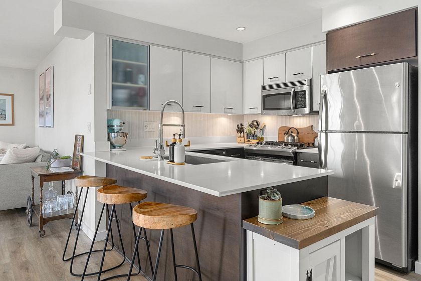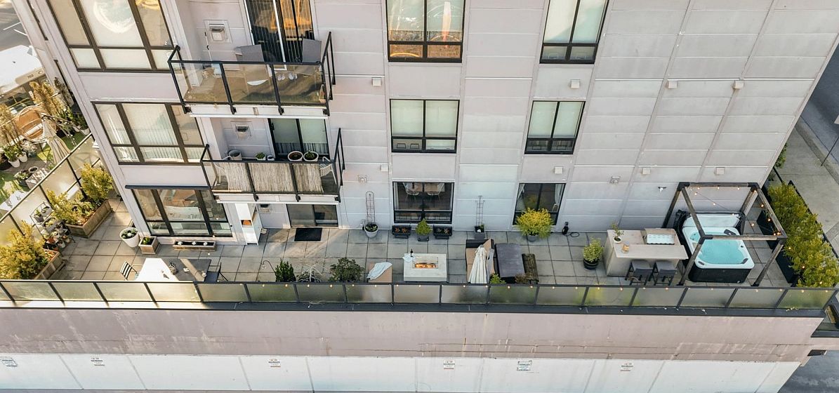 The perfect floorplan, truly one of a kind. This 2 bed + Den (or 3rd bedroom) spans the width of the building with window exposures North, East, and South. An expansive 1,013 sqrft interior and an incredible 999 sqrft private patio provide a townhome feel. Entertainers welcome; the patio boasts a HOT TUB, built-in BBQ and fridge, with bar seating and space for endless plants and gardening. The kitchen features stone counters, stainless steal appliances, new tile backsplash and a gas range. Relax at the fireplace inside or out. No car needed; grocery stores, shopping, parks, restaurants, all within 1 block. Pets and rentals welcome.