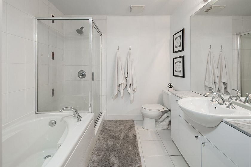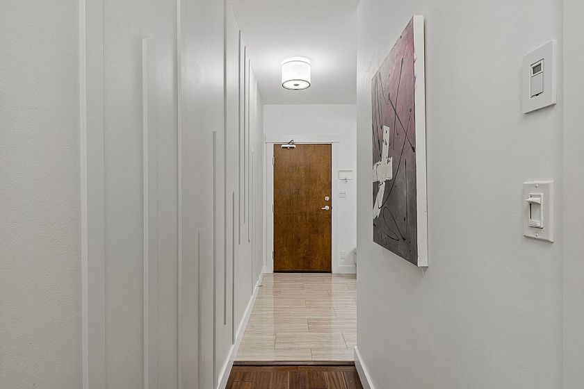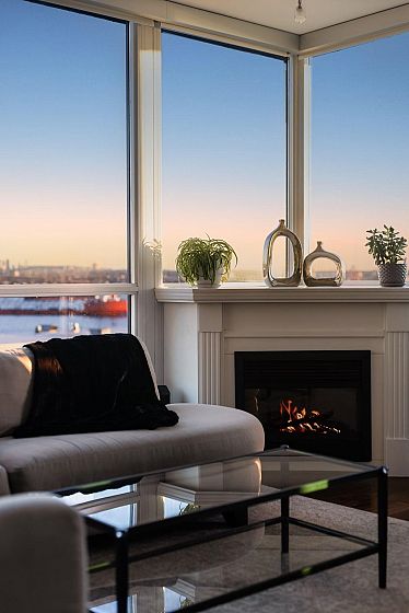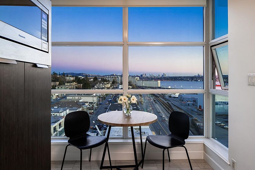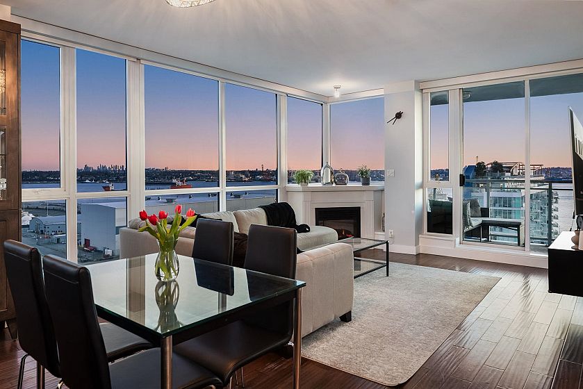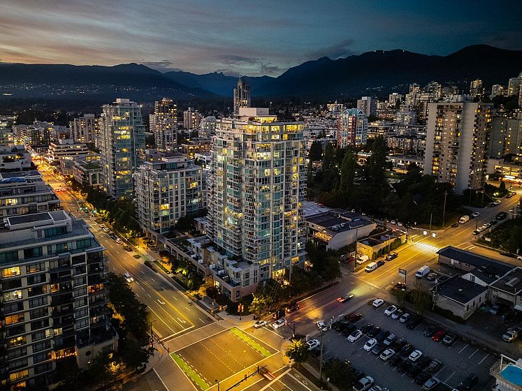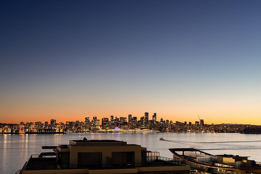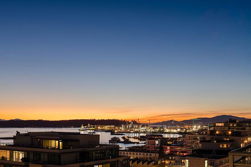 Rare, private, & beautifully updated 2 bed/2 bath & den residence offering over 1,190 sf of refined living w/ PANORAMIC WATER, MTN & CITY VIEWS. This concrete, corner suite boasts floor-to-ceiling windows, automated blinds, AC, & cozy fireplace for year-round comfort. Heart of the home is the chef's kitchen offering S/S appliances, Wolf stove, oversized island, breakfast nook, wine fridge, & ample storage. Thoughtful modern layout features true dining & living areas, generous primary bdrm w/ ensuite, & a spacious 2nd bdrm w/ semi ensuite access for guests or family. Versatile den w/ millwork accent wall is ideal for home office or storage. Enjoy stunning sunsets from your private terrace overlooking DT Vancouver & Lions Gate Bridge. Steps to LOLOs Shipyards & iconic amenities. A must see!