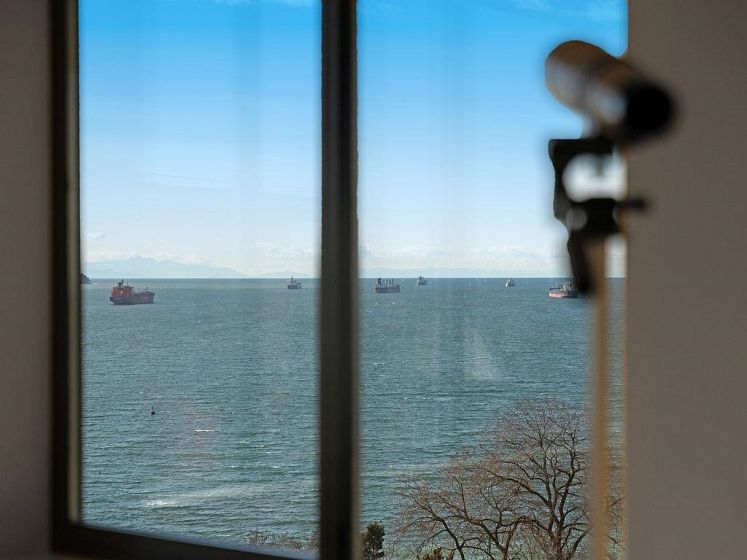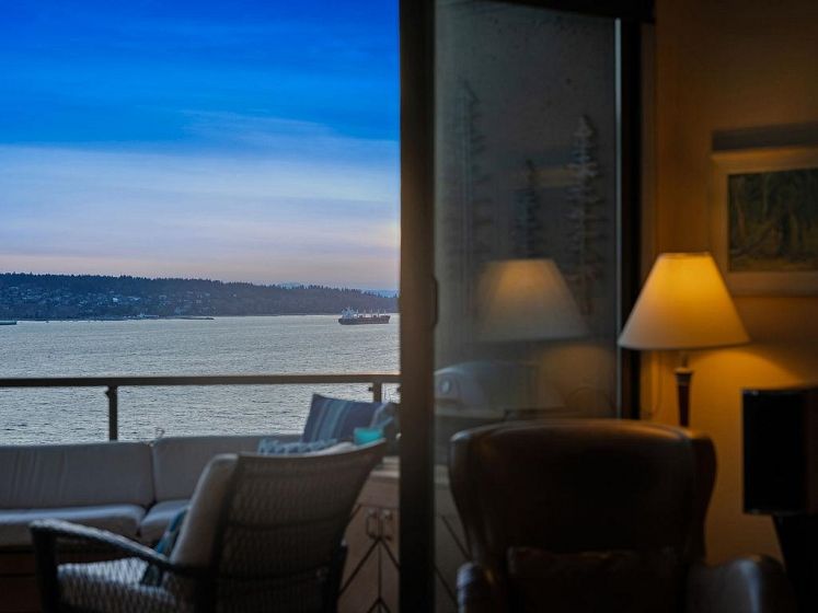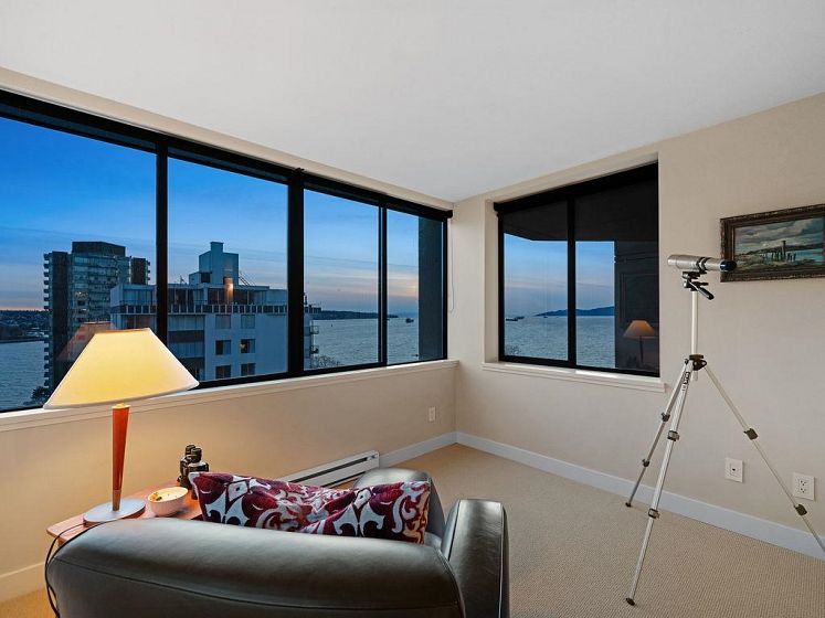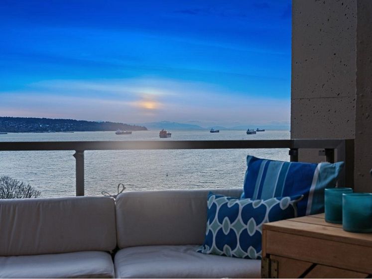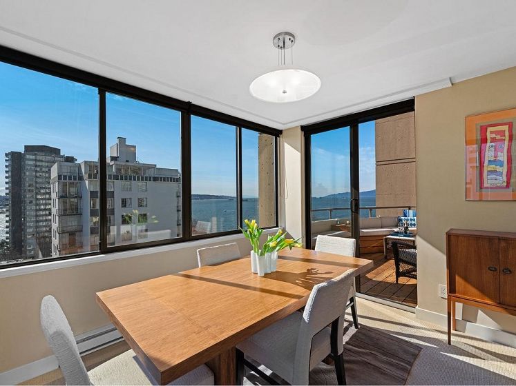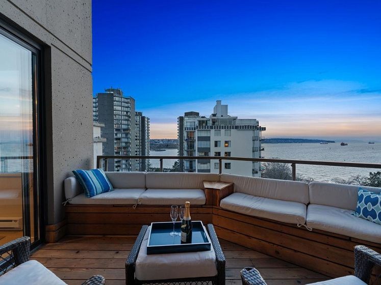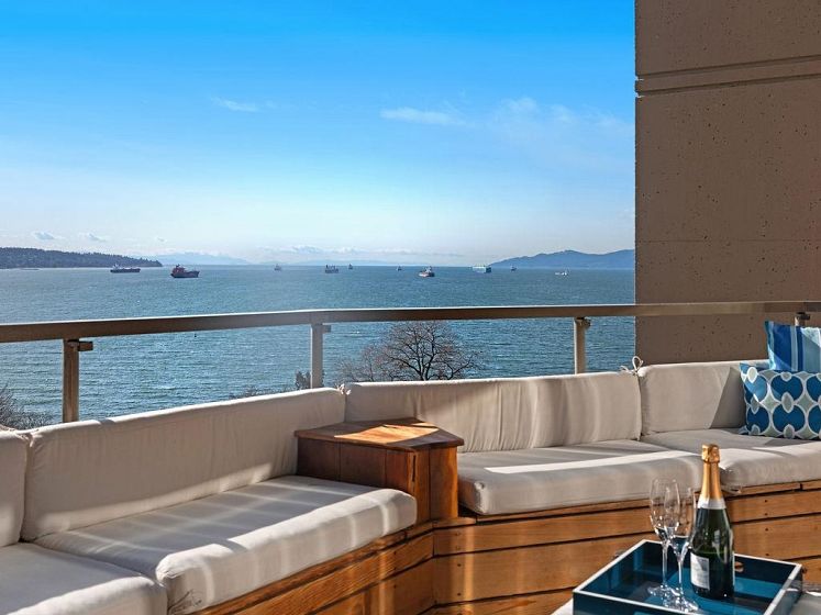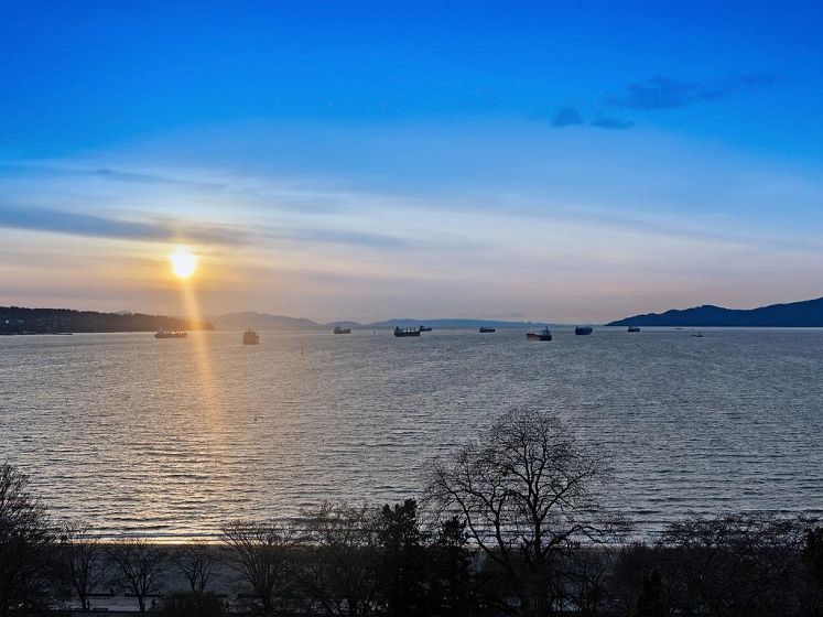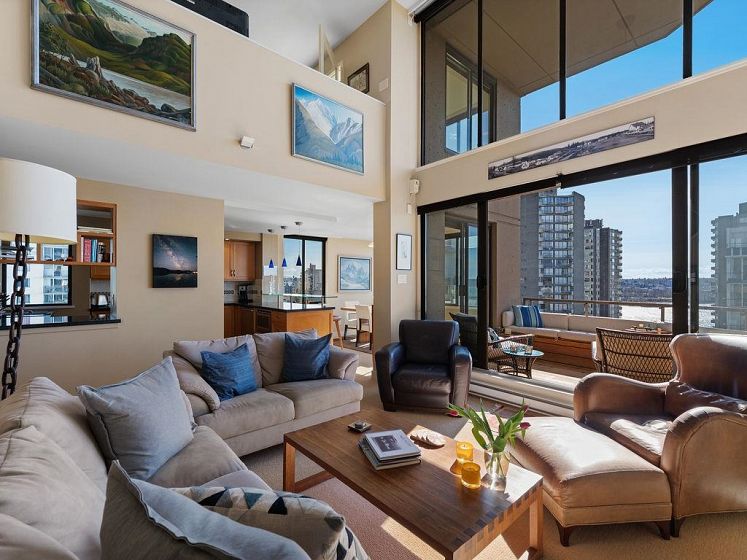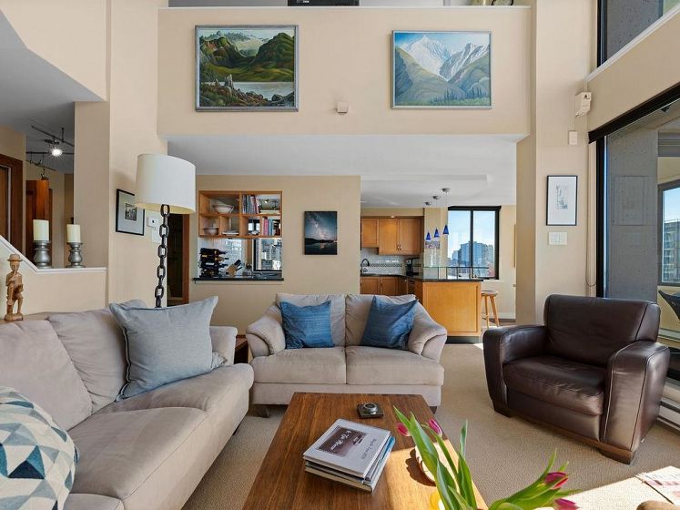 THIS VIEW! One of the best vantage points in the city, with unforgettable sunsets and the mesmerizing waters of English Bay showcased right from your living room. Located in the iconic Alexandra Park, a boutique concrete building in the West End, this one-of-a-kind, two-level residence captures the very best of Vancouver. Soaring 16-ft cathedral ceilings and floor-to-ceiling windows fill the home with natural light, while the open-concept living and dining area flows to a private ocean-view balcony. Upstairs, the loft-style primary suite is a peaceful retreat, while a separate flex space can easily function as a second office, library, or quiet sitting area. Pet-friendly, with 2 parking and 1 locker. Perfectly positioned just half a block from English Bay.