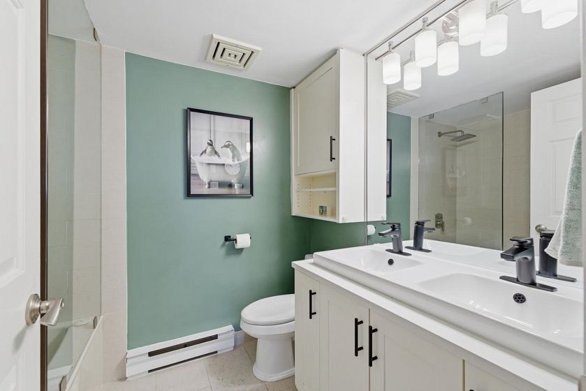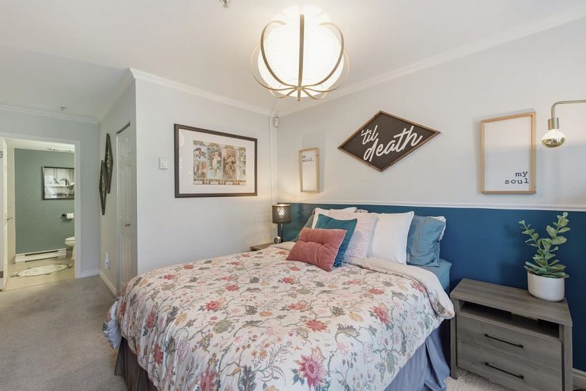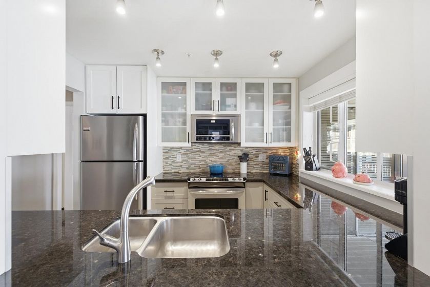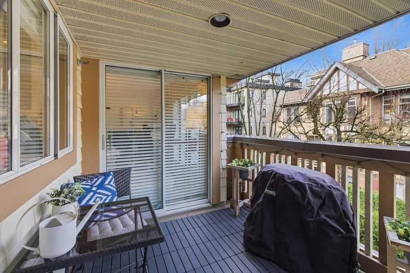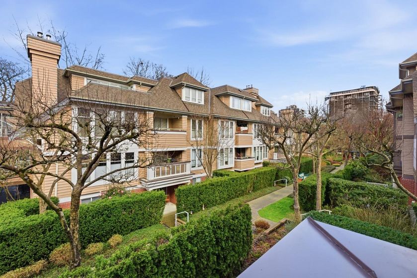 Welcome to Connaught Estates in desirable Fairview. Beautiful bright corner 2 bed/2 bath condo w/open floor plan and quiet treed courtyard outlook. Spacious living room features a gas fireplace w/custom built-in storage and access to a balcony overlooking the courtyard. Kitchen is ideal for entertaining w/modern cabinetry, stainless steel appliances, stone counters and bar seating. Well-separated bedrooms include a king-sized primary w/walk-in closet with California Closet inserts and 5-piece ensuite w/double sinks. Features include large windows, in-suite laundry and storage, high fiber internet Updates:hot water tank & dishwasher (2021),washer/dryer (2025). Close to Douglas Park,SkyTrain, VGH,shopping and dining. No hard flooring. 2 parking space & 1 storage locker. 2 small pets allowed.