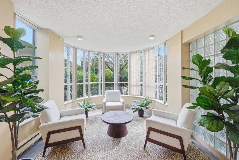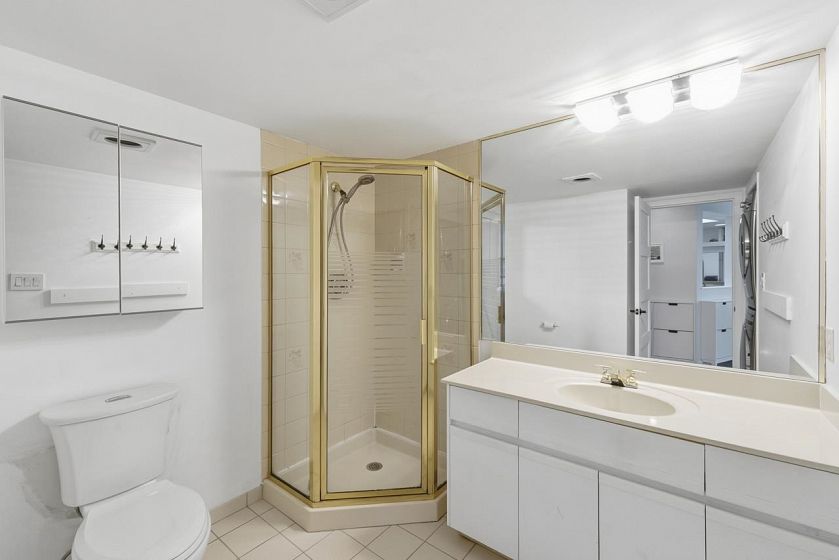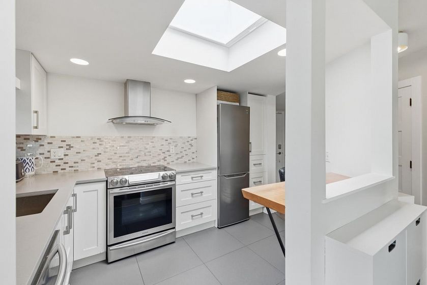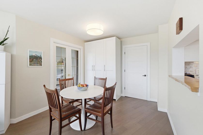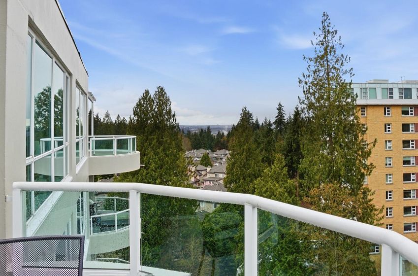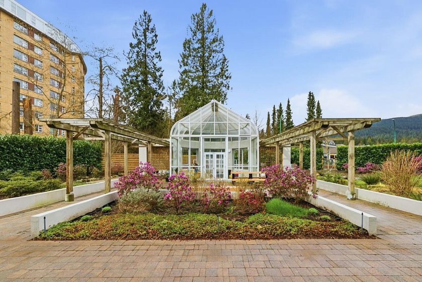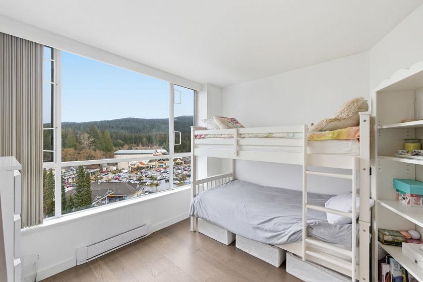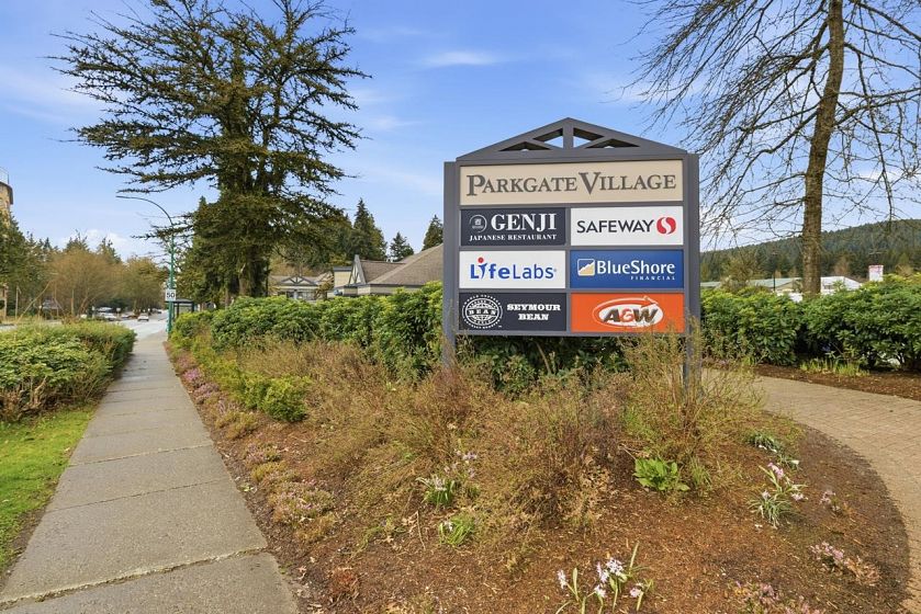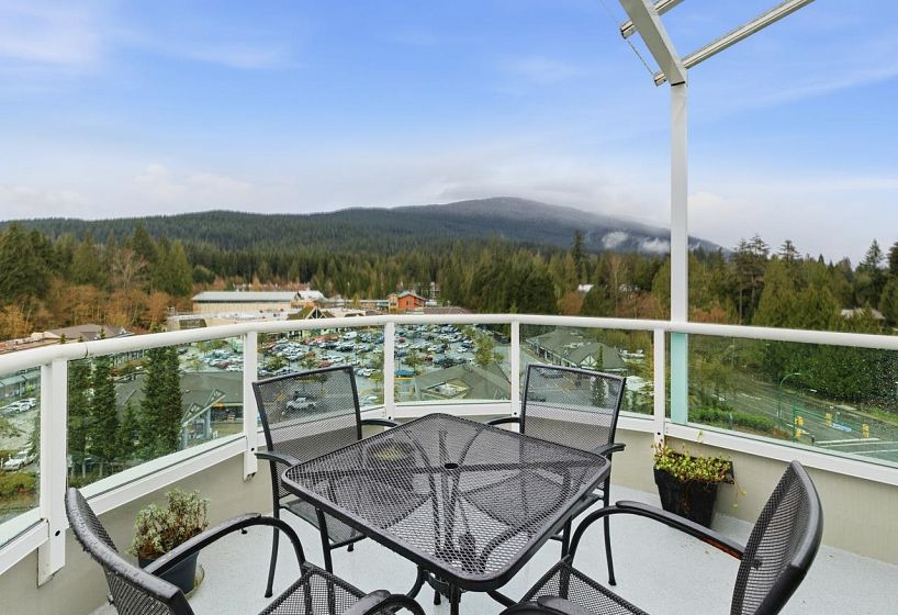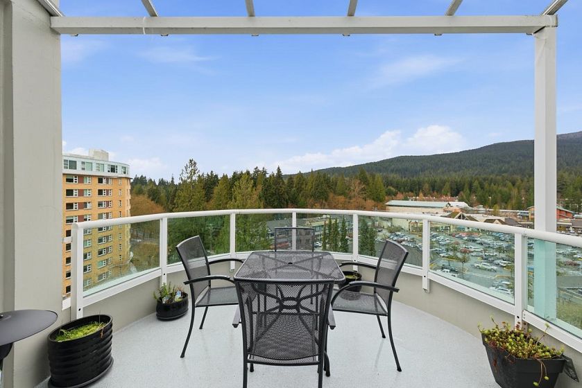 Bright sub-penthouse in a solid BOSA-built concrete building, just steps to shops, services, transit, and close to Mt. Seymour, parks, and trails. The suite features thoughtful updates including quartz countertops, a live-edge coffee bar, stainless steel appliances, and neutral laminate and tile flooring. Floor-to-ceiling windows and two skylights (kitchen and primary bath) enhance the natural light, while concrete construction ensures a quiet living environment. A functional layout offers flexibility for working from home, along with in-suite laundry. Bathrooms remain largely original and present a straightforward opportunity for future updates. Sliders from the living area and primary bedroom open to a private, large partially covered deck with sweeping mountain views