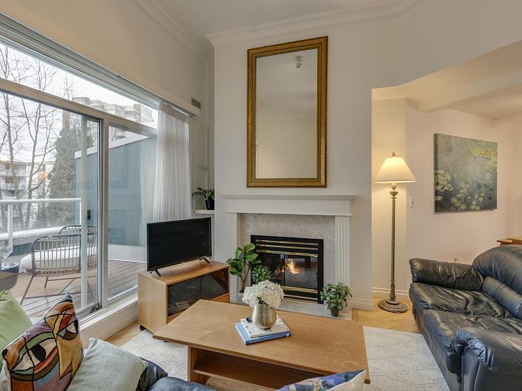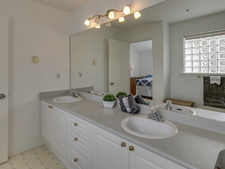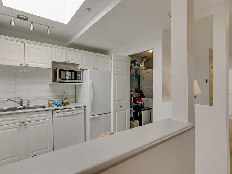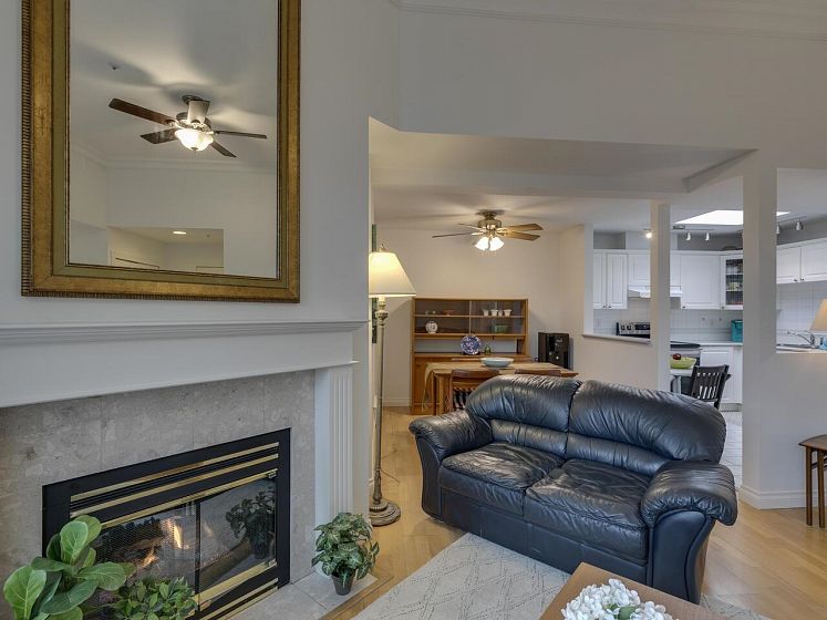 The Library offers a great central Lonsdale location for this meticulous top-floor, two-bedroom/two-bathroom home. Offering 1,068 sq. ft. of freshly painted living space, the vaulted ceiling and skylights fill the area with natural light. Generous living & dining rooms are perfect for entertaining, opening to a spacious Trex balcony. Kitchen has ample counter space & cupboards. A separate laundry room offers tons of storage. Large primary bedroom has an ensuite featuring a walk-in shower, double sinks, and a walk-in closet. Second full bathroom with a soaker tub. Includes one parking stall and l storage locker. Building amenities include a gym, bike storage, and a meeting room. With a walk score of 93, this location is a walker's paradise! Steps to public transit & Victoria Park