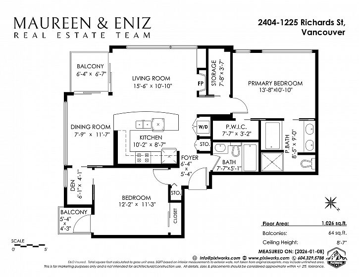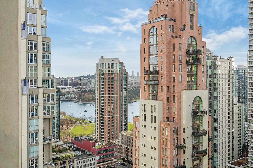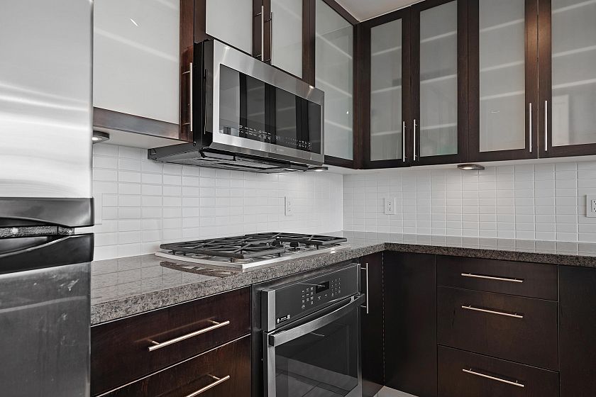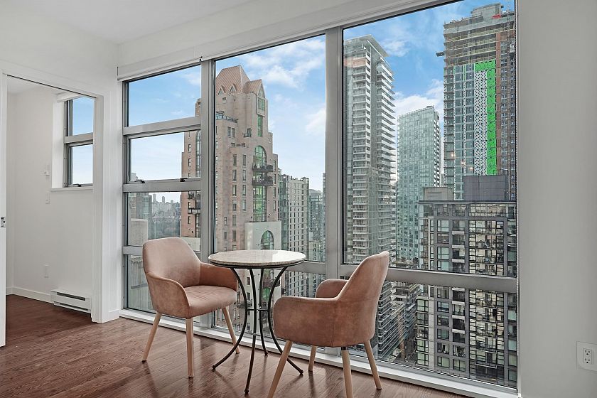SUB PENTHOUSE. Bosa's elegant Eden on Yaletown's Emery Barnes Park. 1 of only 4 elite-level units with over height ceilings, 2 outdoor patios, glorious water & mountain views. Superb layout of this 1026 sqft perfect 2bd/2bth home features: king-size bedrooms + den, tons of extra storage, oversize open-concept kitchen w/ gas stove, granite countertops & 10ft eating counter, distinct living & dining spaces, real hardwood floors throughout & master 5-piece ensuite. Tons of natural light reflecting from floor to ceiling windows. New updates include appliances, blinds, shelving and freshly painted. Amenities include guest suite, meeting room, gym, hot tub & sauna. 2 PARKING SPOTS, storage Locker and AC Approved by strata. Located steps from Shops, Groceries, Entertainment, Dinning and Parks.