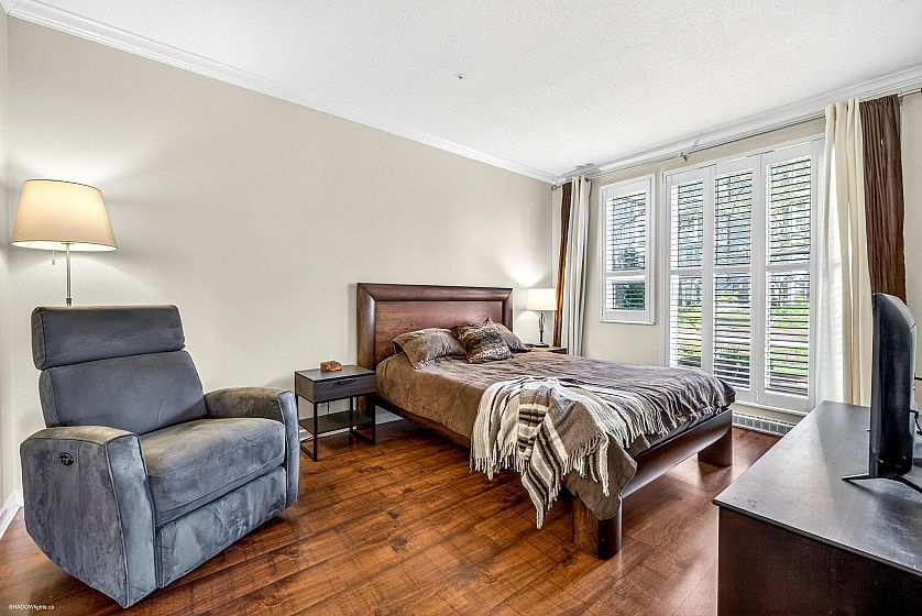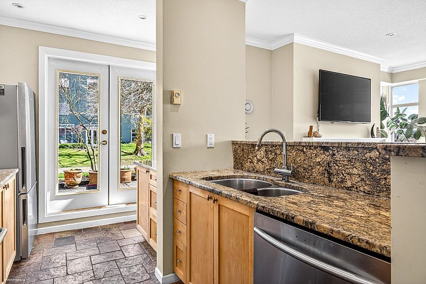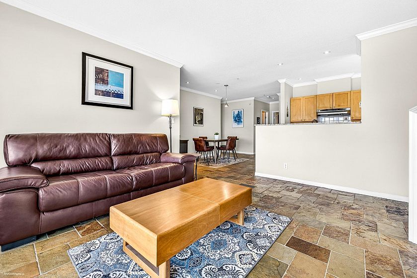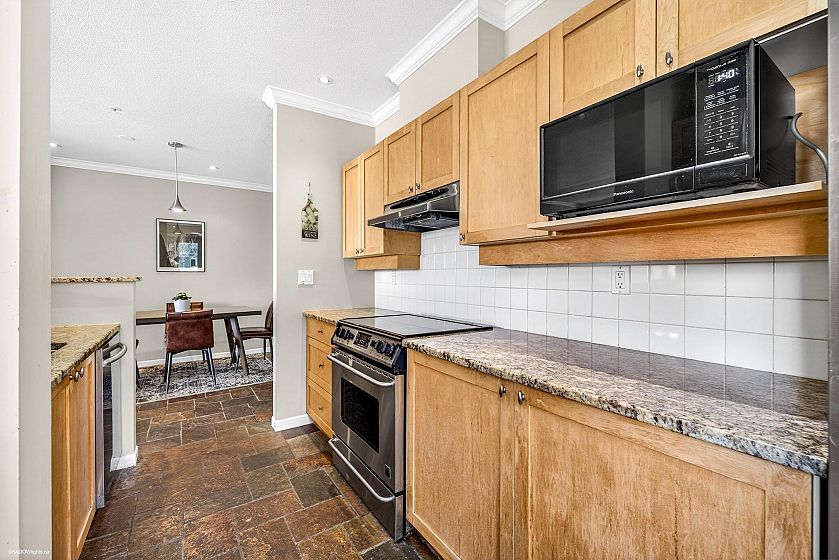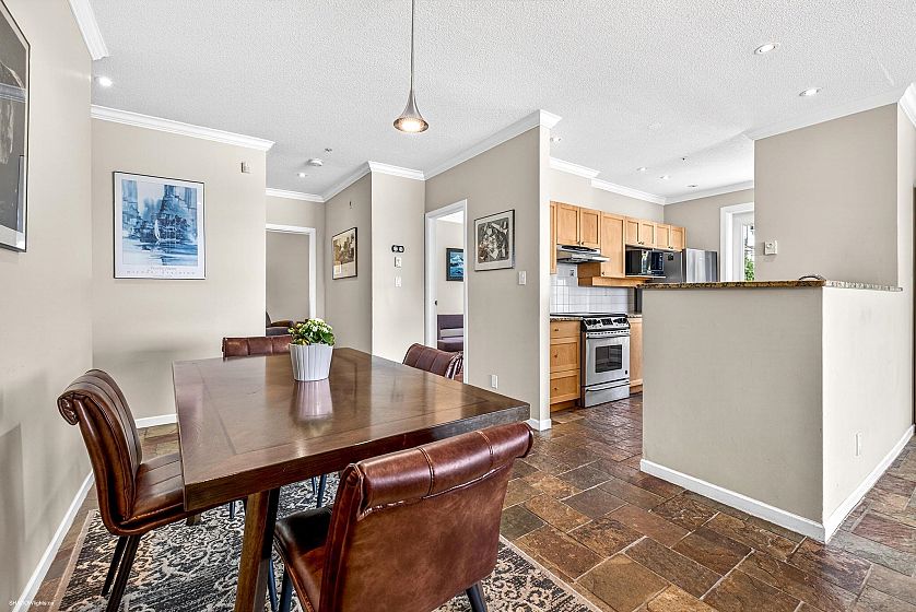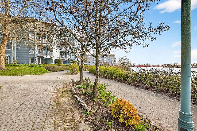 Spectacular, unobstructed river views define this beautifully renovated 1,085 sq. ft. 2-bedroom, 2-bathroom corner unit—arguably the best in the building. Step outside to your impressive 860 sq. ft. wraparound private patio, perfect for entertaining or relaxing in a true indoor-outdoor oasis. The open-concept interior features slate tile flooring, quality laminate in the bedrooms, and a stylish kitchen with S/S appliances, granite countertops, an under-mount sink, and eating bar, plus a separate dining area. Enjoy a cozy gas fireplace, designer paint colours, crown moulding, updated window coverings, in-suite laundry, and two full bathrooms. Includes two side-by-side underground parking stalls, bike storage, clubhouse with a gym, and hot tub. Pet-friendly, with up to two Pets allowed.