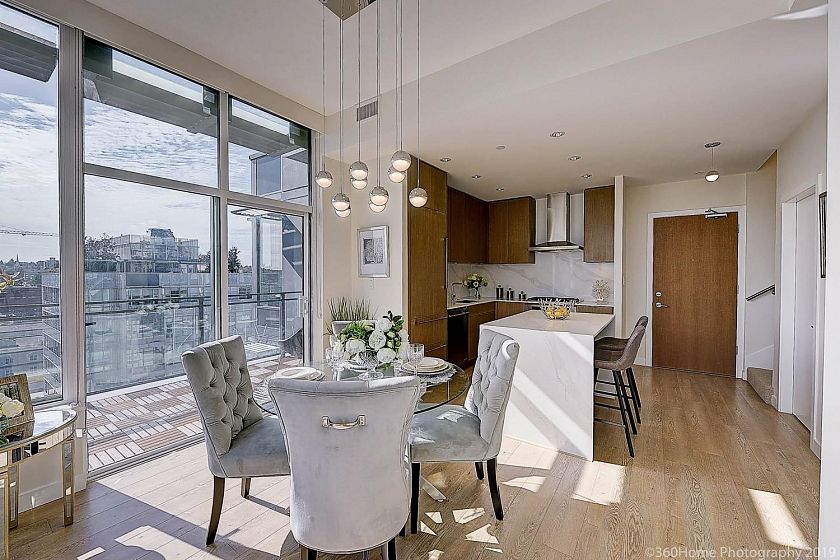 Penthouse living at Block 100 with soaring ceilings and expansive floor-to-ceiling windows capturing stunning city and mountain views. This bright, open-concept home features a sleek kitchen with premium appliances, quartz countertops, and ample storage, flowing seamlessly into spacious living and dining areas. Step onto the private balcony to enjoy morning coffee or evening sunsets. Located in the heart of Olympic Village, just steps to the Seawall, parks, cafes, breweries, and transit. A rare opportunity to own a top-floor home in one of Vancouver's most vibrant communities. Viewing by appointment.