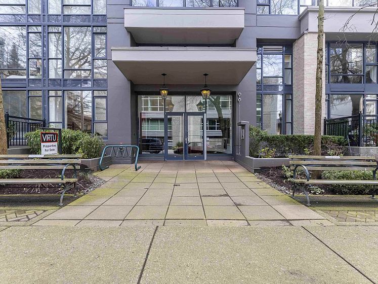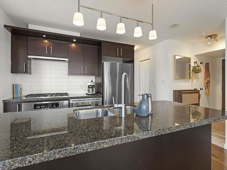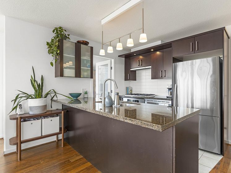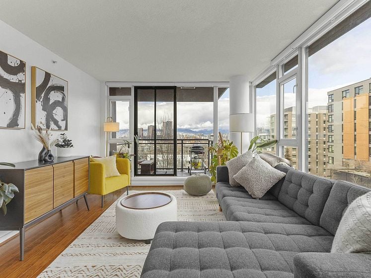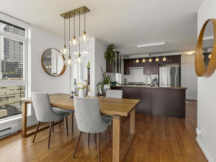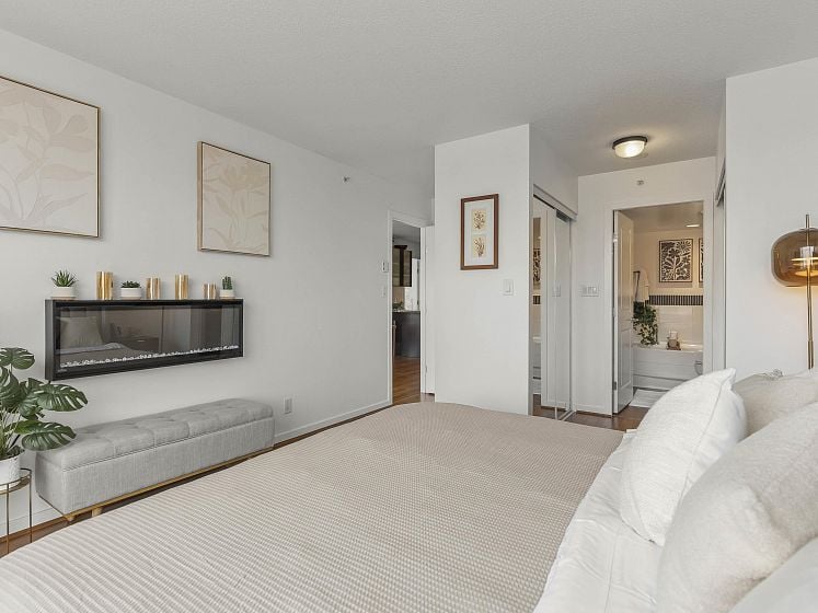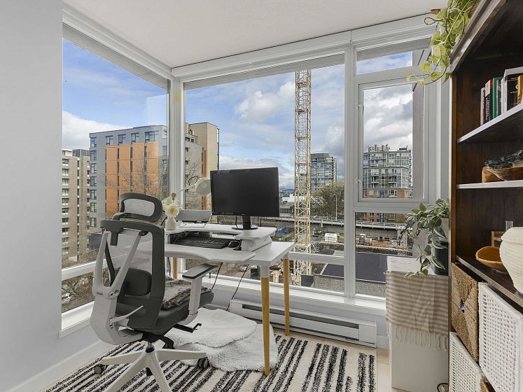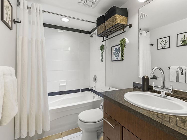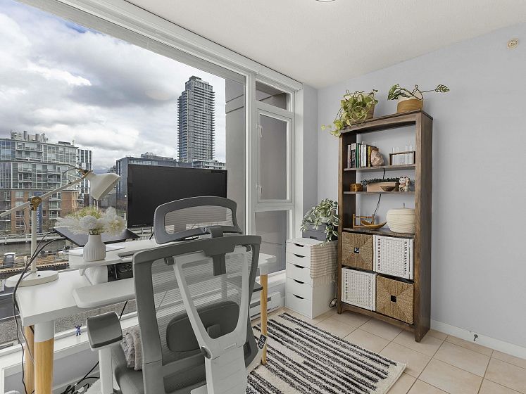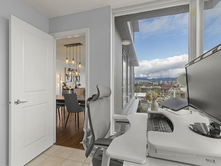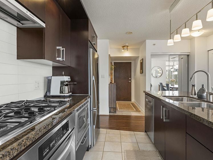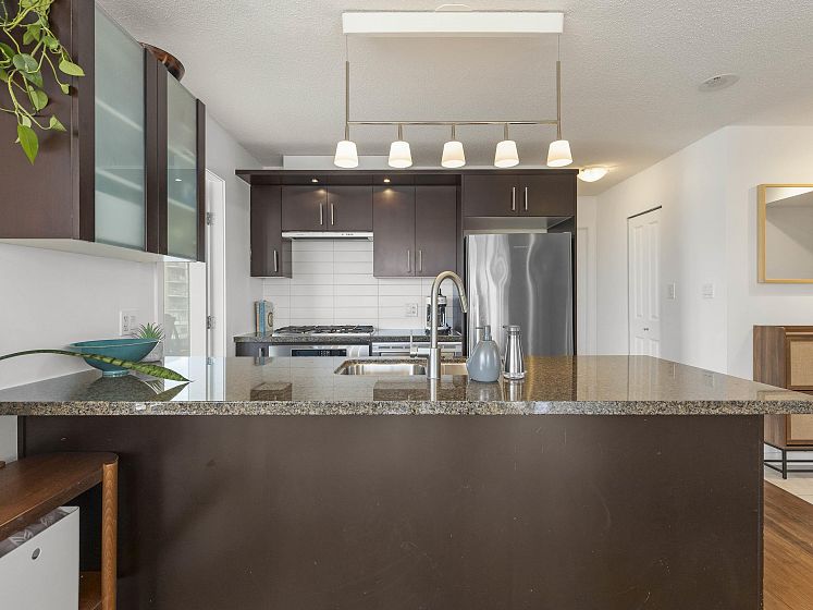 Rare offering at Virtu. Corner 2 bed, 2 bath + den and flex home with southeast exposure and sweeping city, water, and North Shore mountain views through floor-to-ceiling windows. Bright, well-designed layout with excellent bedroom separation. Open-concept living/dining flows to a generous view balcony, ideal for everyday living and entertaining. Kitchen features full-size SS appliances, gas cooktop, stone counters, and ample cabinetry. Spacious primary with 5-piece ensuite. Den and flex offer great options for office and storage. Lightly lived in with bamboo and tile flooring, built-ins, and in-suite laundry. 1 parking, 1 storage. Concrete building steps to shops, cafes, and transit.