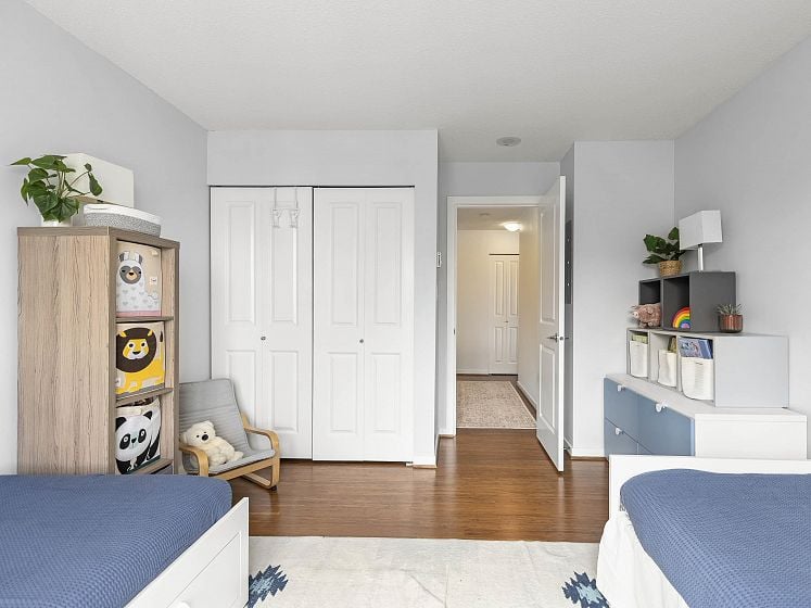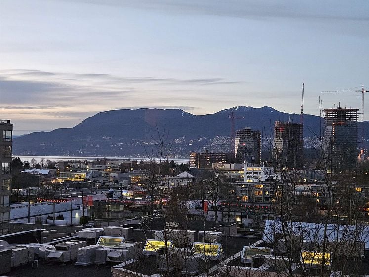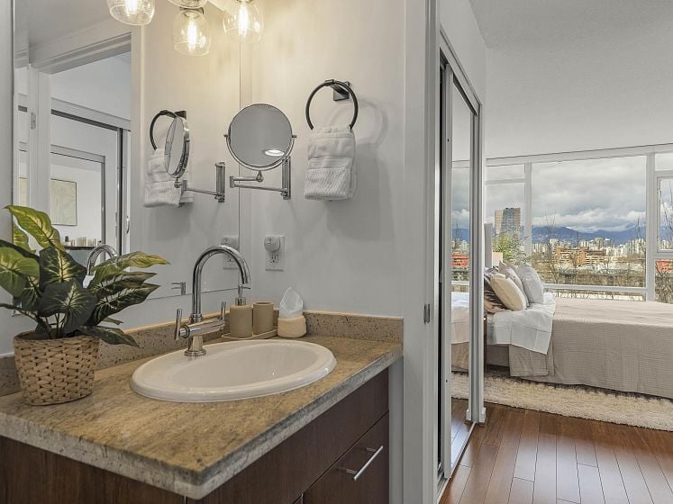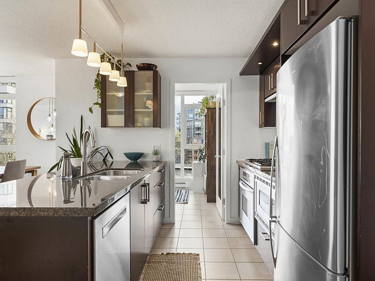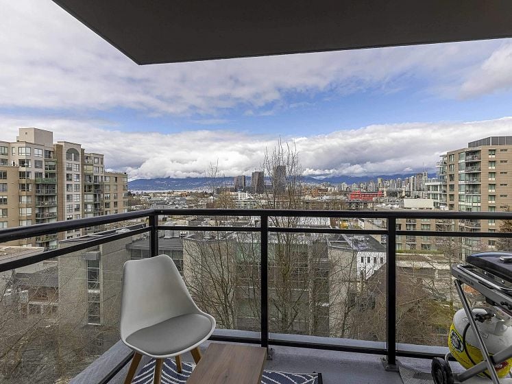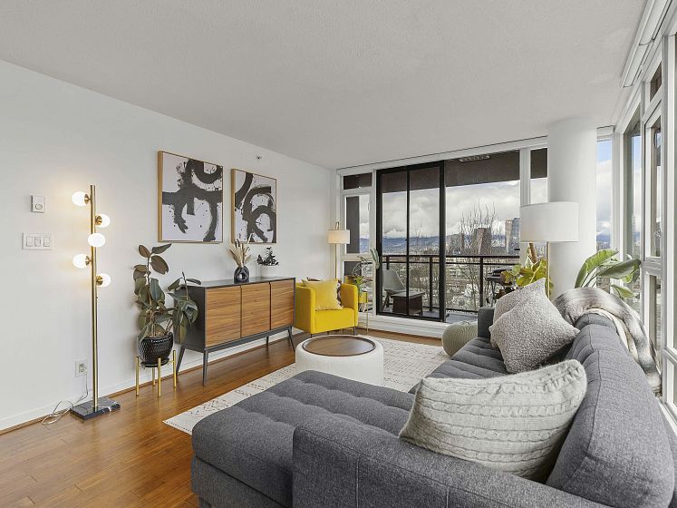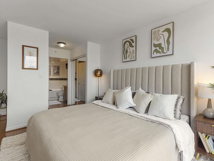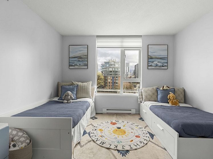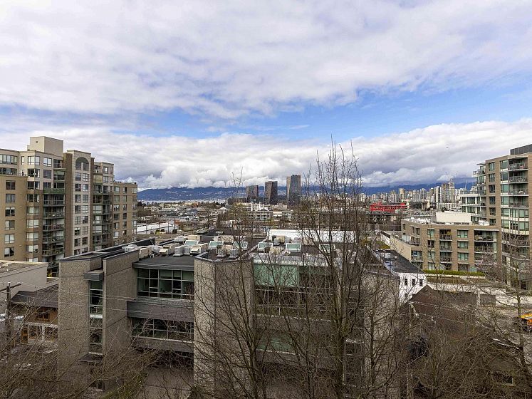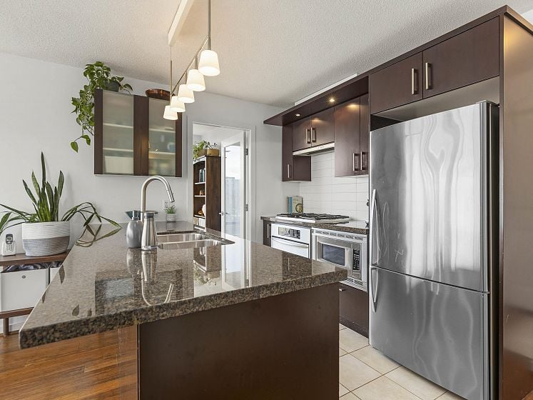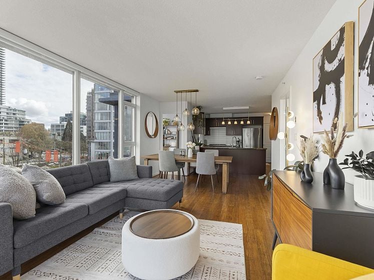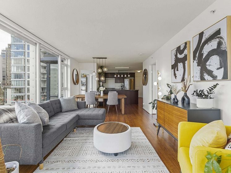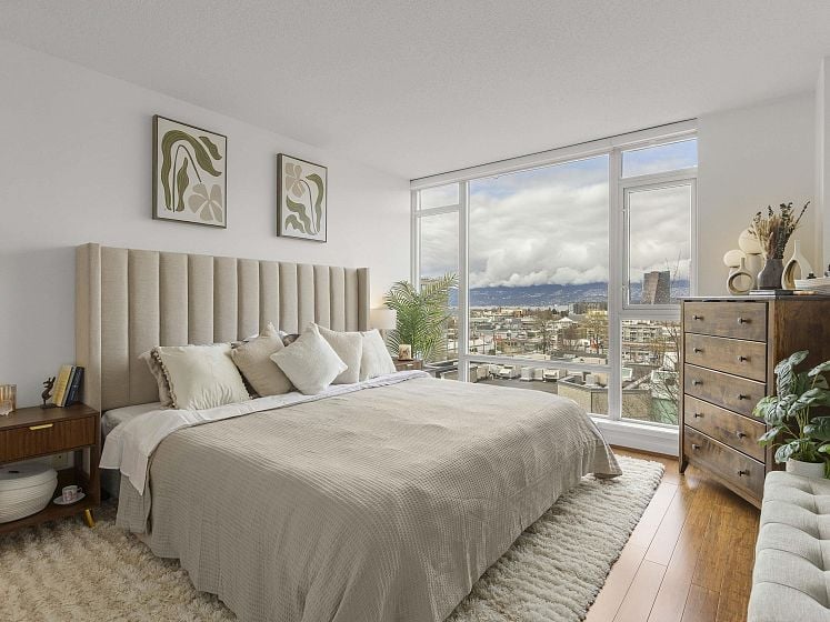 Rare offering at Virtu. Corner 2 bed, 2 bath + den and flex home with southeast exposure and sweeping city, water, and North Shore mountain views through floor-to-ceiling windows. Bright, well-designed layout with excellent bedroom separation. Open-concept living/dining flows to a generous view balcony, ideal for everyday living and entertaining. Kitchen features full-size SS appliances, gas cooktop, stone counters, and ample cabinetry. Spacious primary with 5-piece ensuite. Den and flex offer great options for office and storage. Lightly lived in with bamboo and tile flooring, built-ins, and in-suite laundry. 1 parking, 1 storage. Concrete building steps to shops, cafes, and transit.