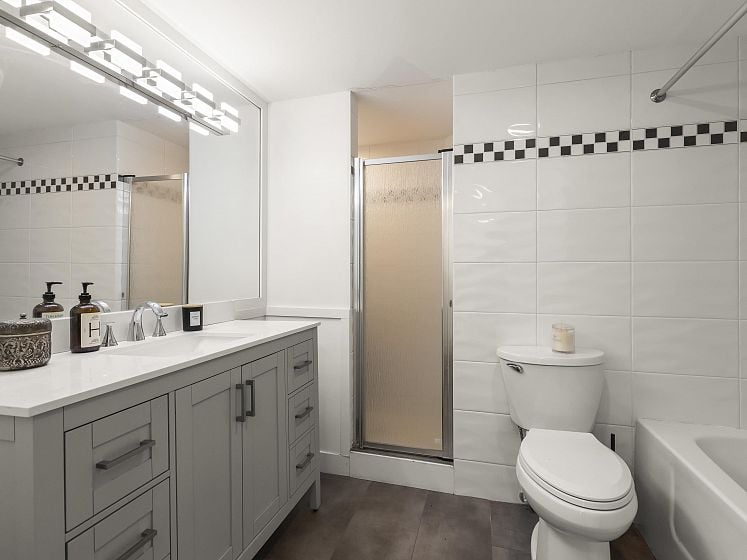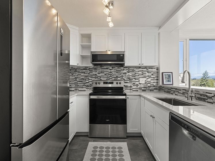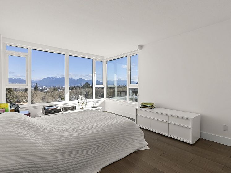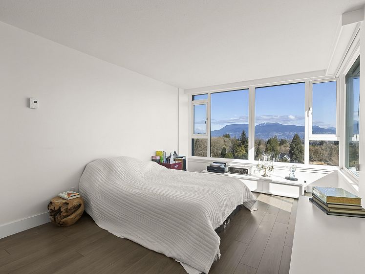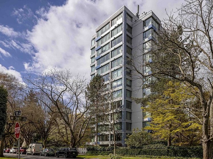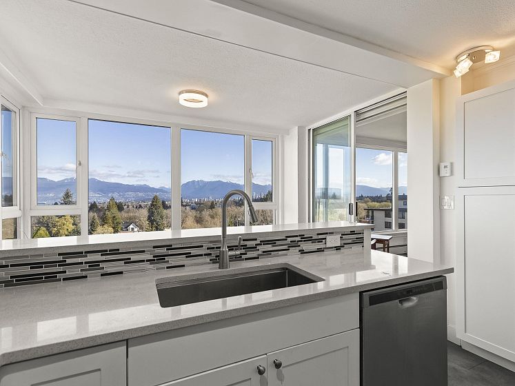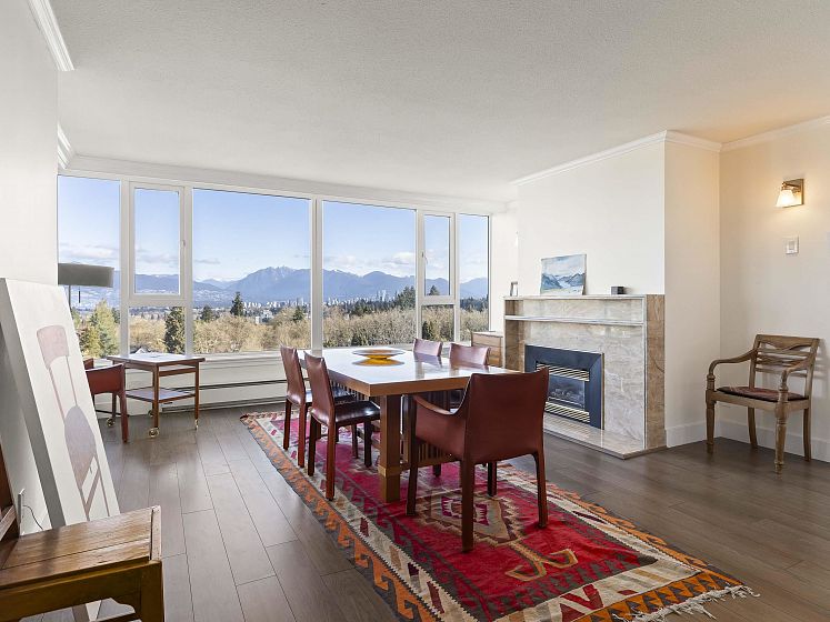 WOW! TOTALLY RENOVATED, BRIGHT and spacious N/W/E VIEW unit, welcomes you with its UNOBSTRUCTED, SPECTACULAR VIEWS of BURRARD INLET AND SHIPS, WHITE CAP MOUNTAINS & CITY VIEWS. The unit spans across the entire north wall with West and East corner windows. 2 bedrm, 2 bathrm, 2 parking, 1356 s.f. apartment, sparkles with the ever changing scenery. Enjoy the entertaining size living rm, dining rm + eating area with wood floors, gas fireplace, updated bathrms & kitchen, s/s appliances and quartz countertops. New building plumbing throughout, newer elevators & windows. Very well maintained building and gardens. 3 suits per floor. In the heart of Kerrisdale, walk to shops, restaurants, community center & pool. 1 cat/no dogs, no balcony. One resident must be 55+. You will love it. Open Sun 2-4.